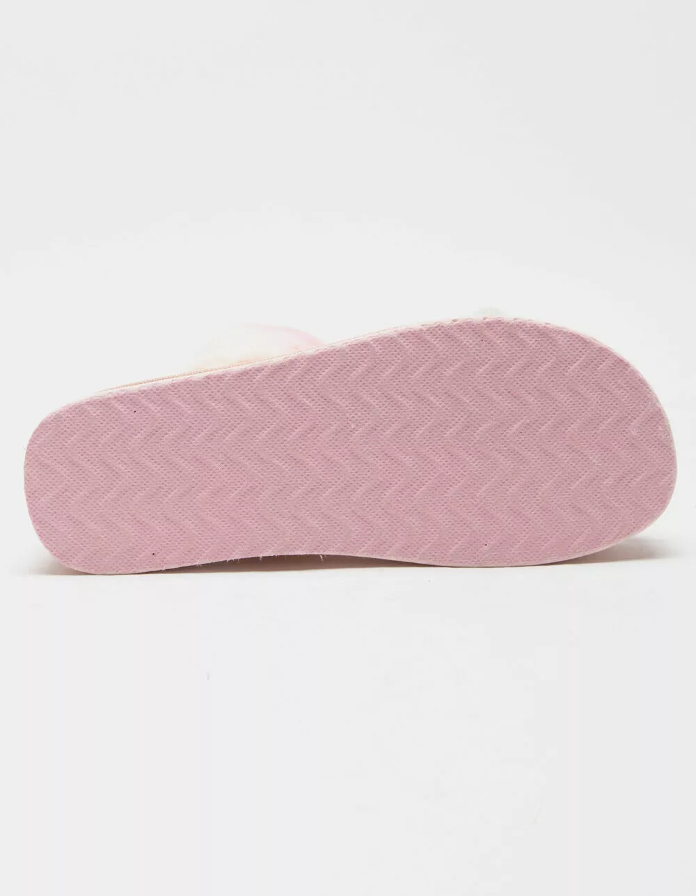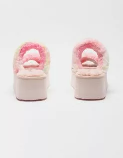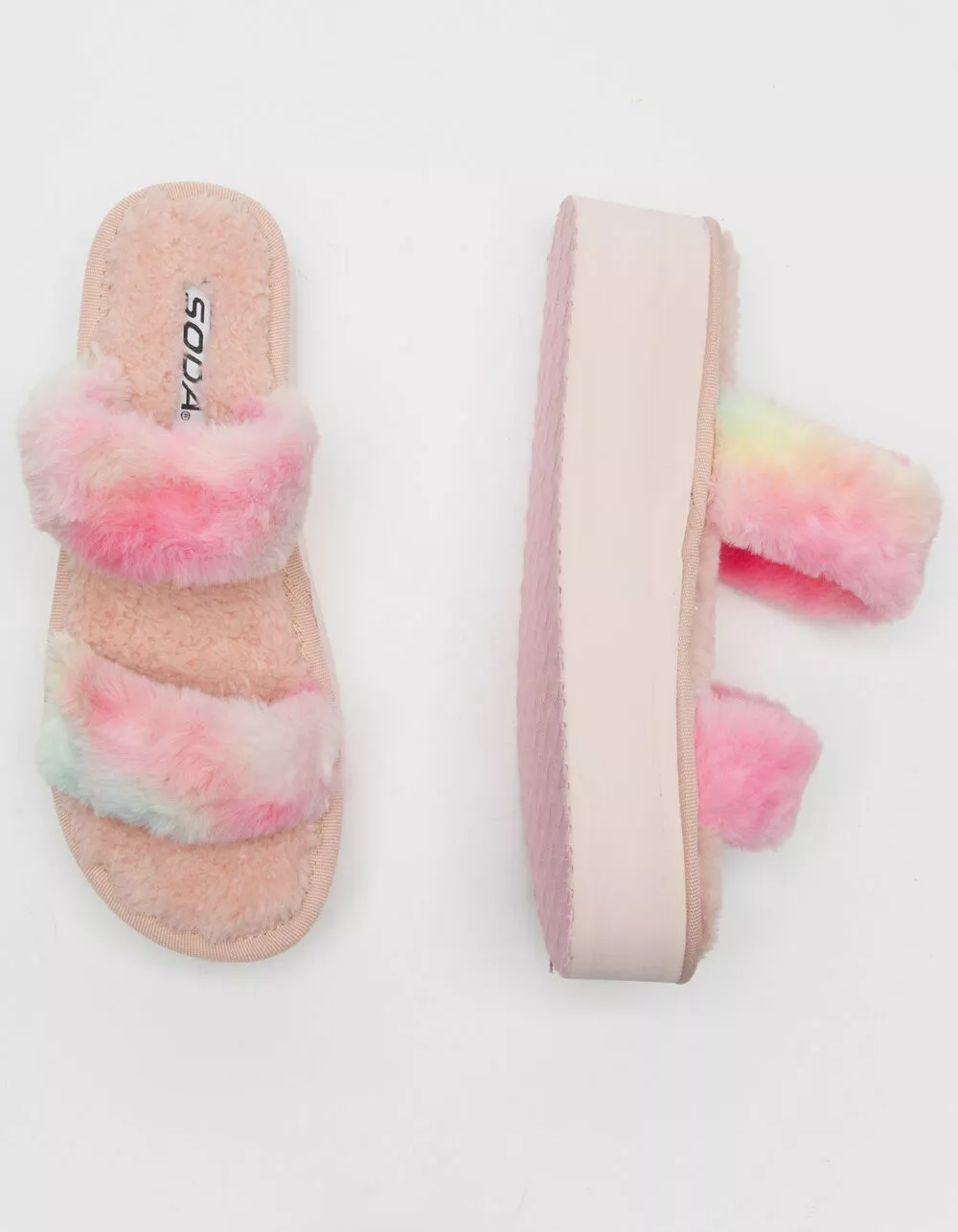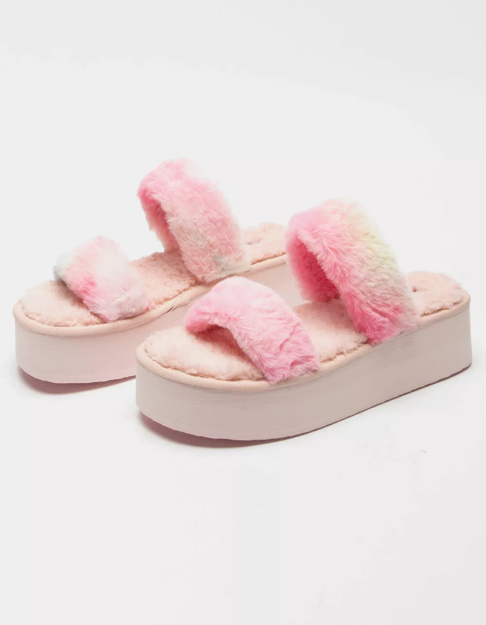 Soda Dual Strap Faux Fur Flatform Sandals. Soft faux fur upper with tie dye wash and two foot straps. Faux fur footbed. Woven binding. Foam flatform outsole. Approx. height: 2″. Imported.