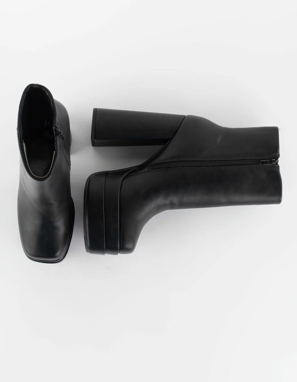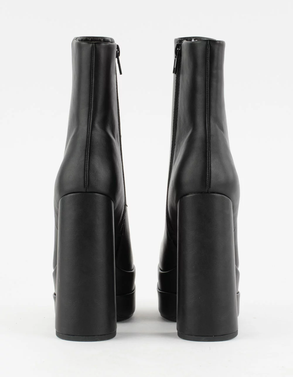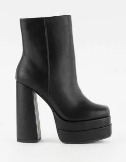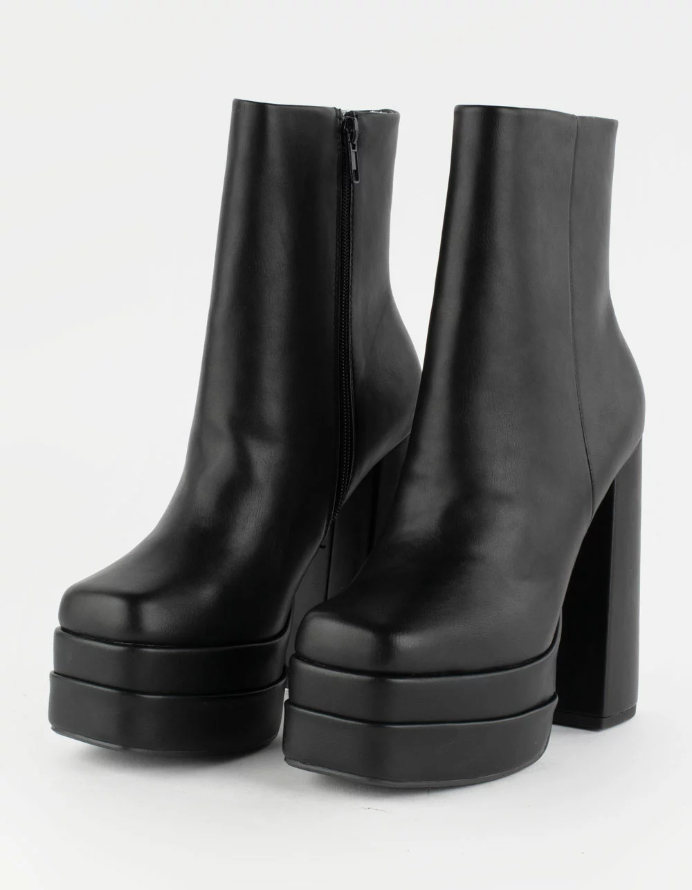 Soda Ferrero Double Platform Ankle Boots. Features a faux leather upper. Square toe. Double stacked platform sole. Exterior zipper for easy on/off. Block synthetic heel. Approx. heel height: 5.75″. Platform height: 2″. Imported.
