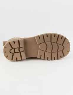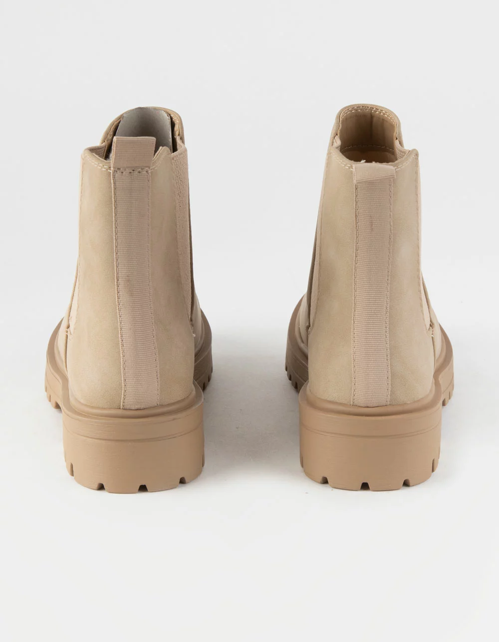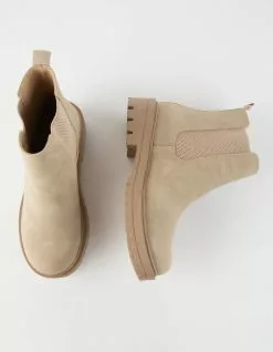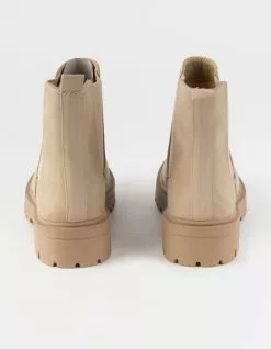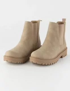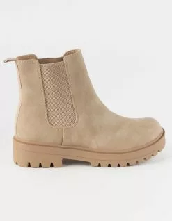Soda Flat Chelsea Boots. Features a faux leather upper. Elastic gores at sides. Synthetic tread outsole. Heel loop. Approx. platform height: 1.5″. Imported.