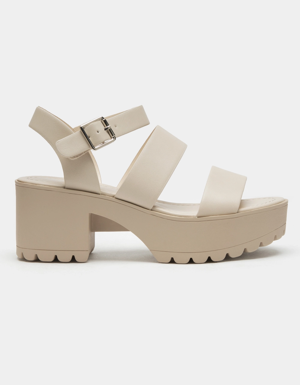 Soda Lug Sole Ankle Strap Platform Sandals. Faux leather upper. Dual foot straps. Adjustable ankle strap with buckle closure. Rubber textured lug sole. Padded footbed. Approx. platform height: 2.75″. Imported.