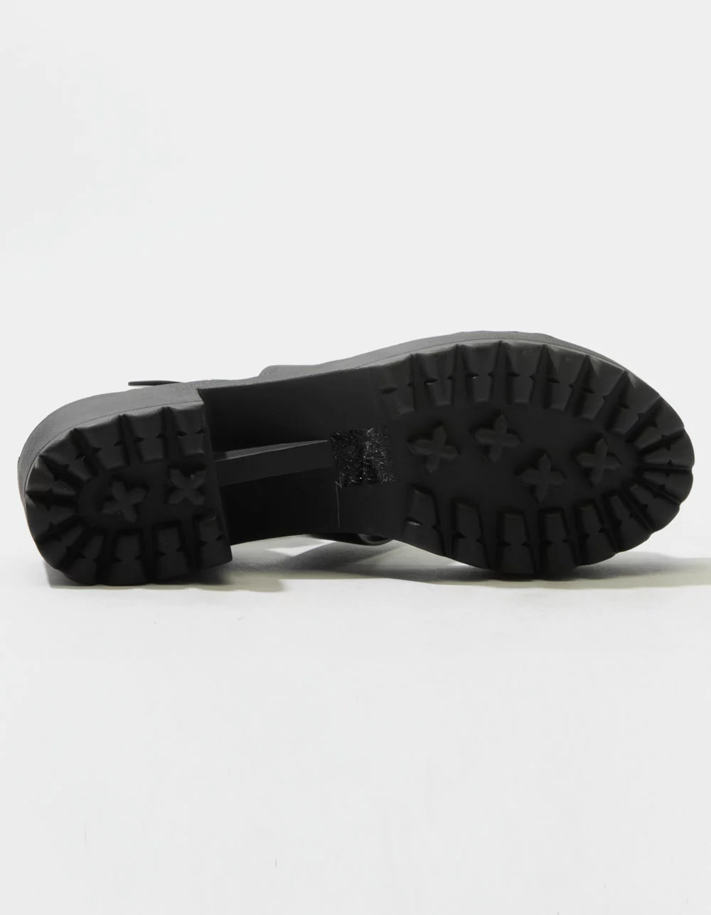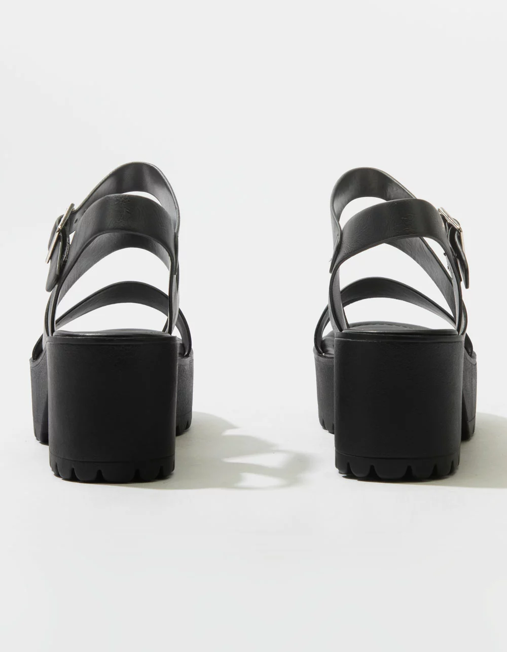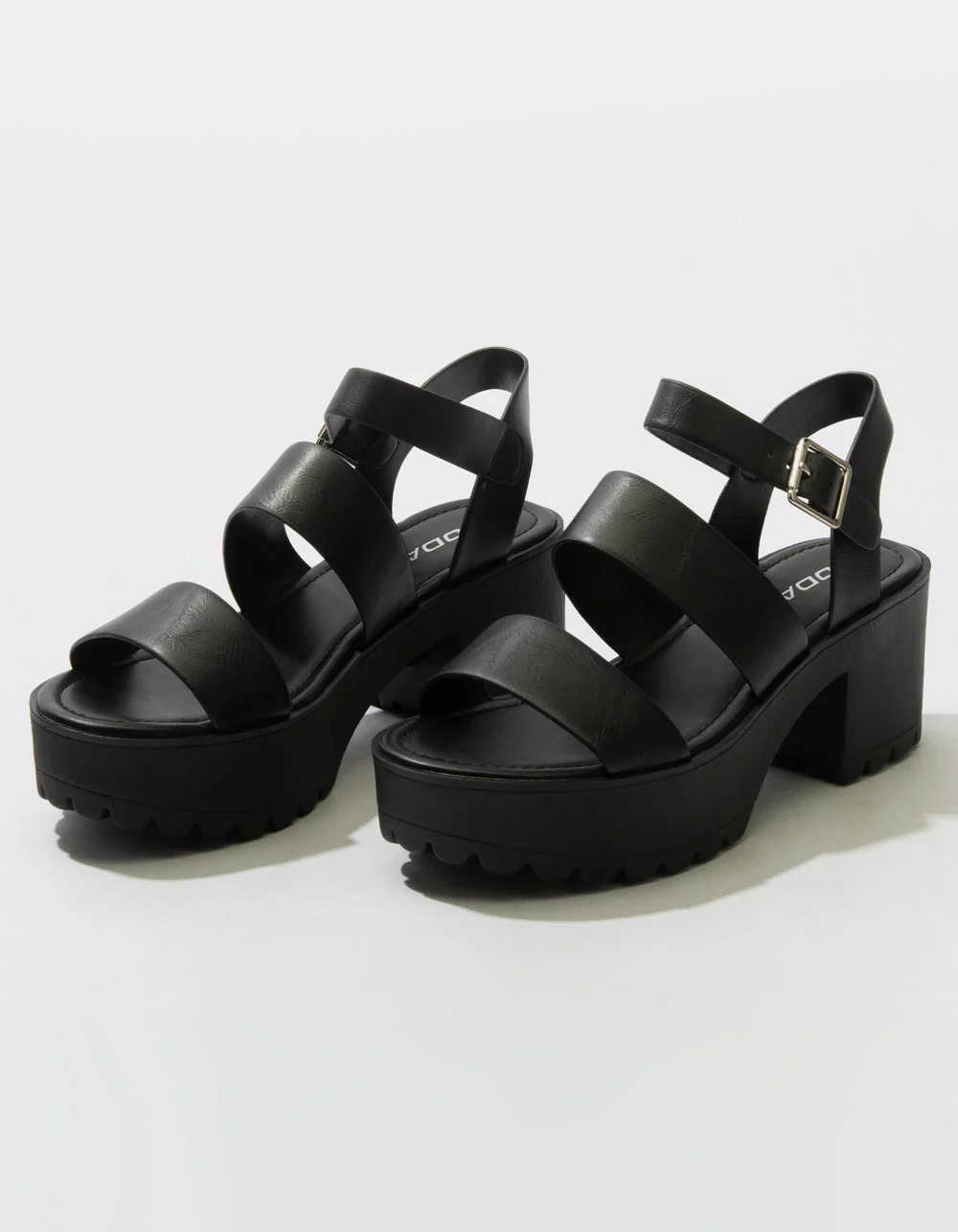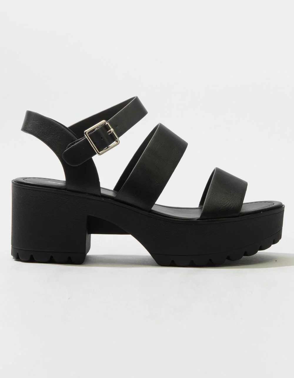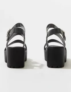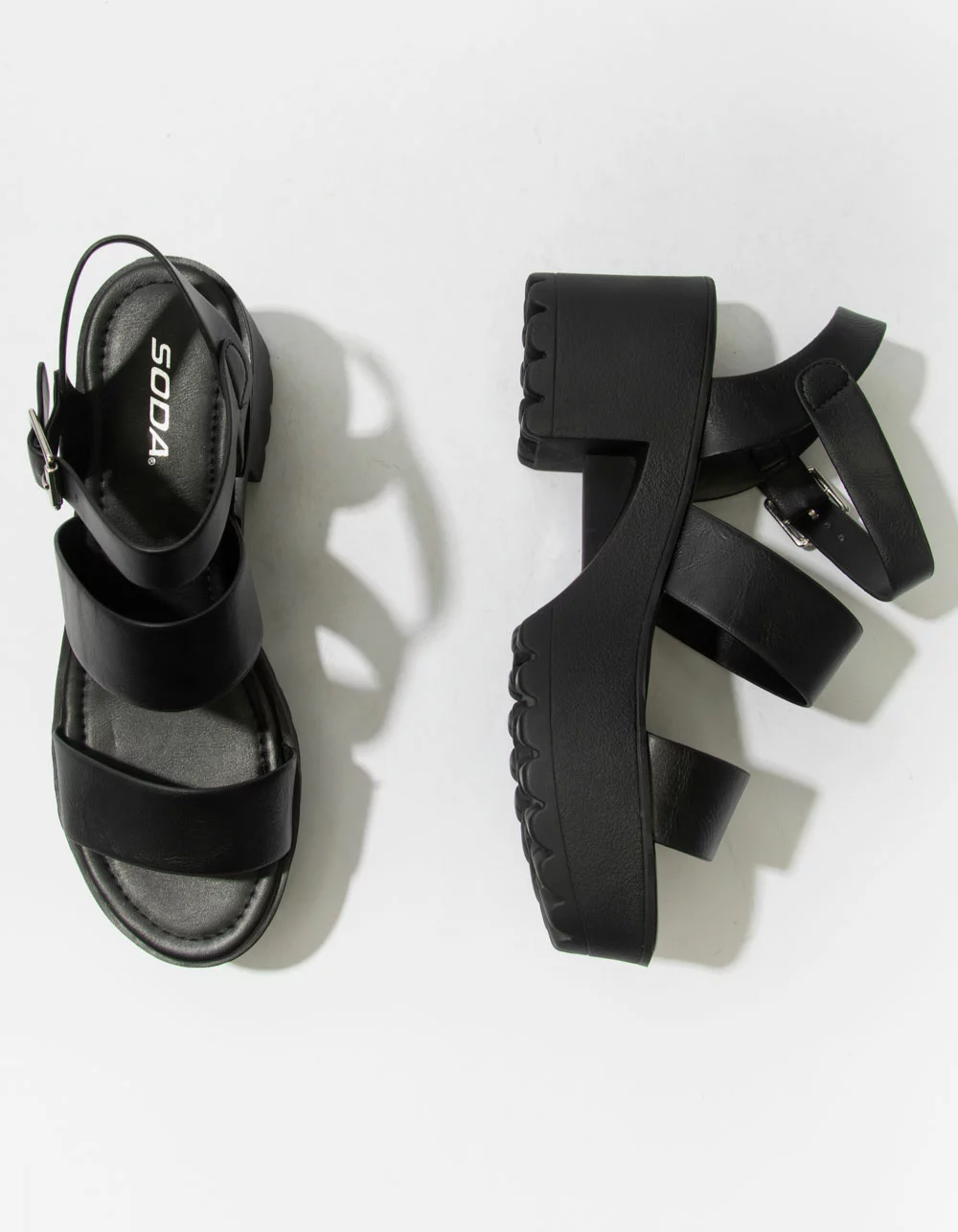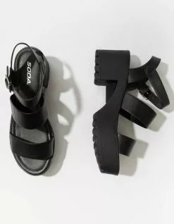 Soda Lug Sole Ankle Strap Platform Sandals. Faux leather upper. Dual foot straps. Adjustable ankle strap with buckle closure. Rubber textured lug sole. Padded footbed. Approx. platform height: 2.75″. Imported.