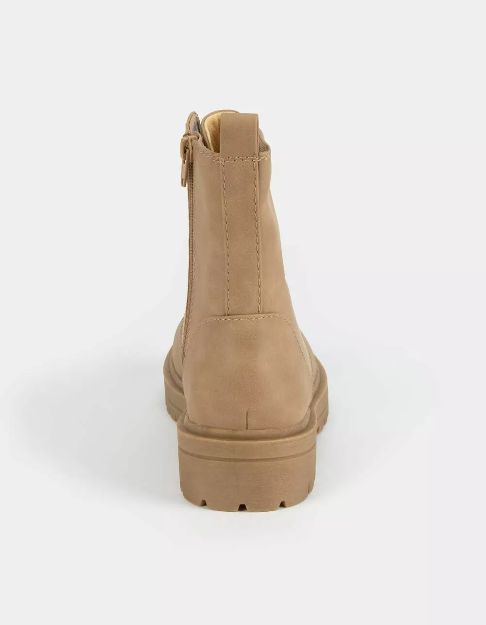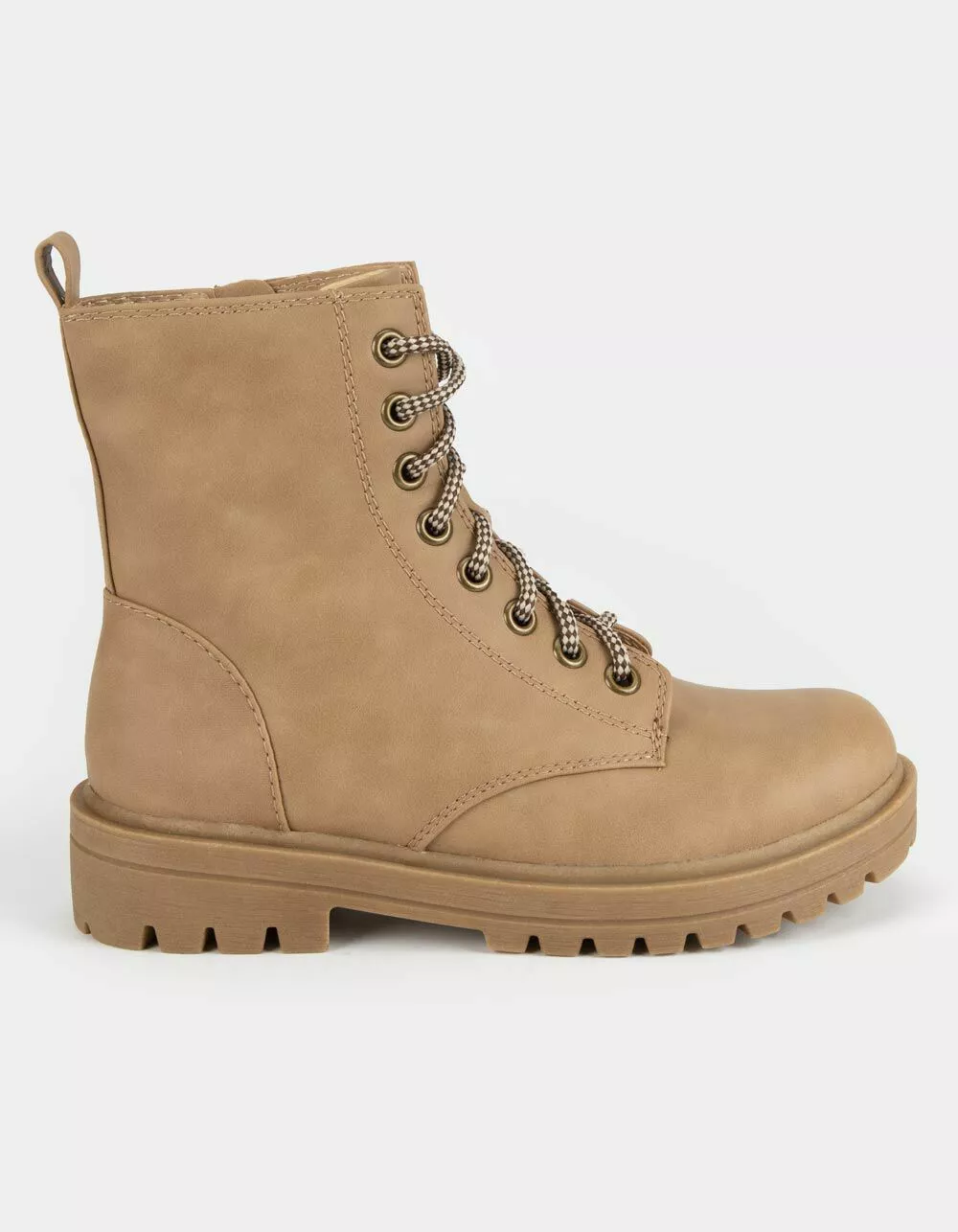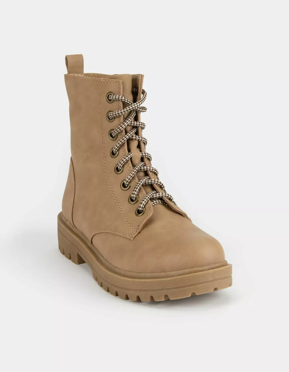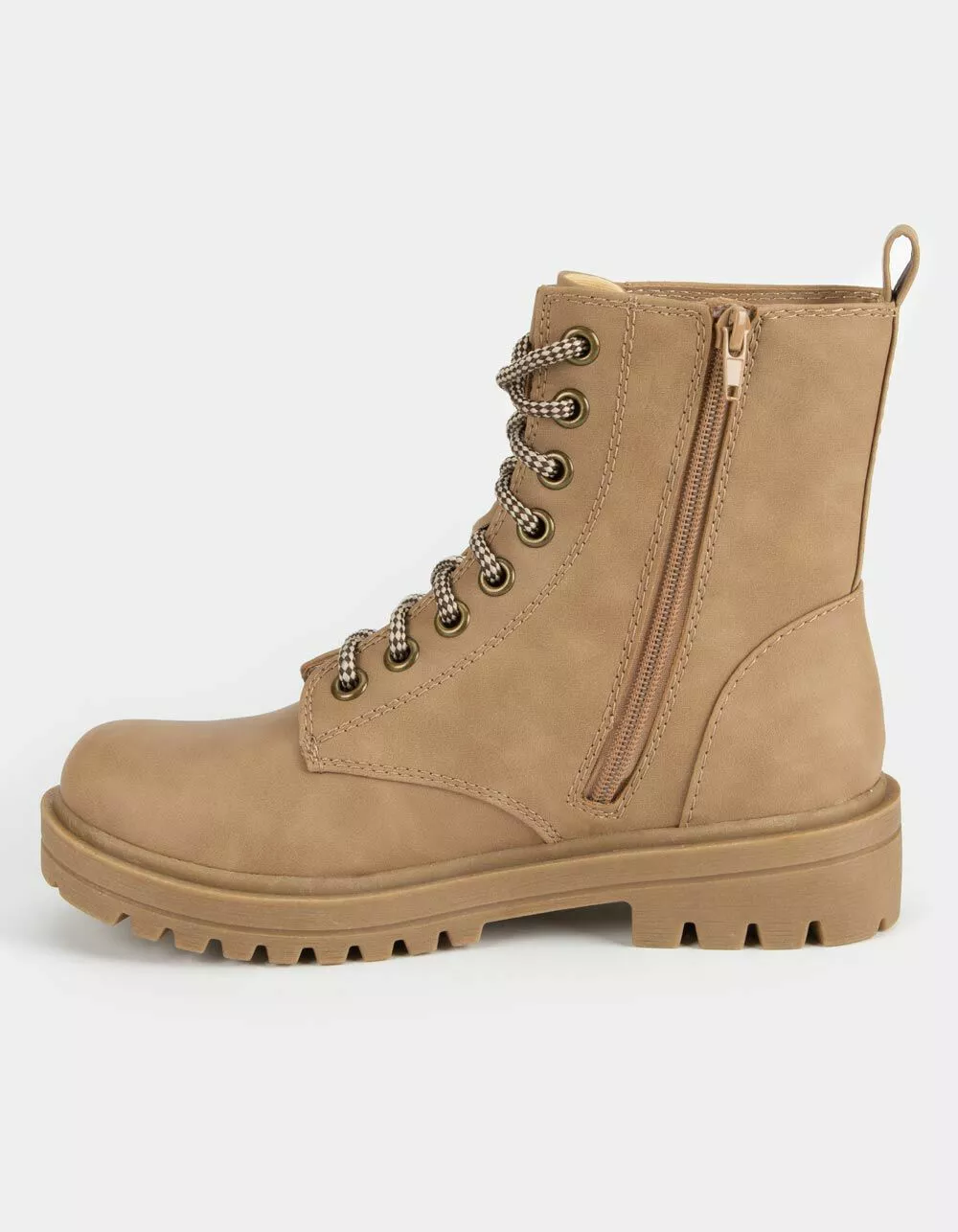 Soda Lug Sole combat boots. Faux leather combat boots. Lace up with novelty ties. Features an inner zip closure for easy on and off. Synthetic lug sole. Imported.
