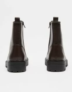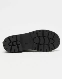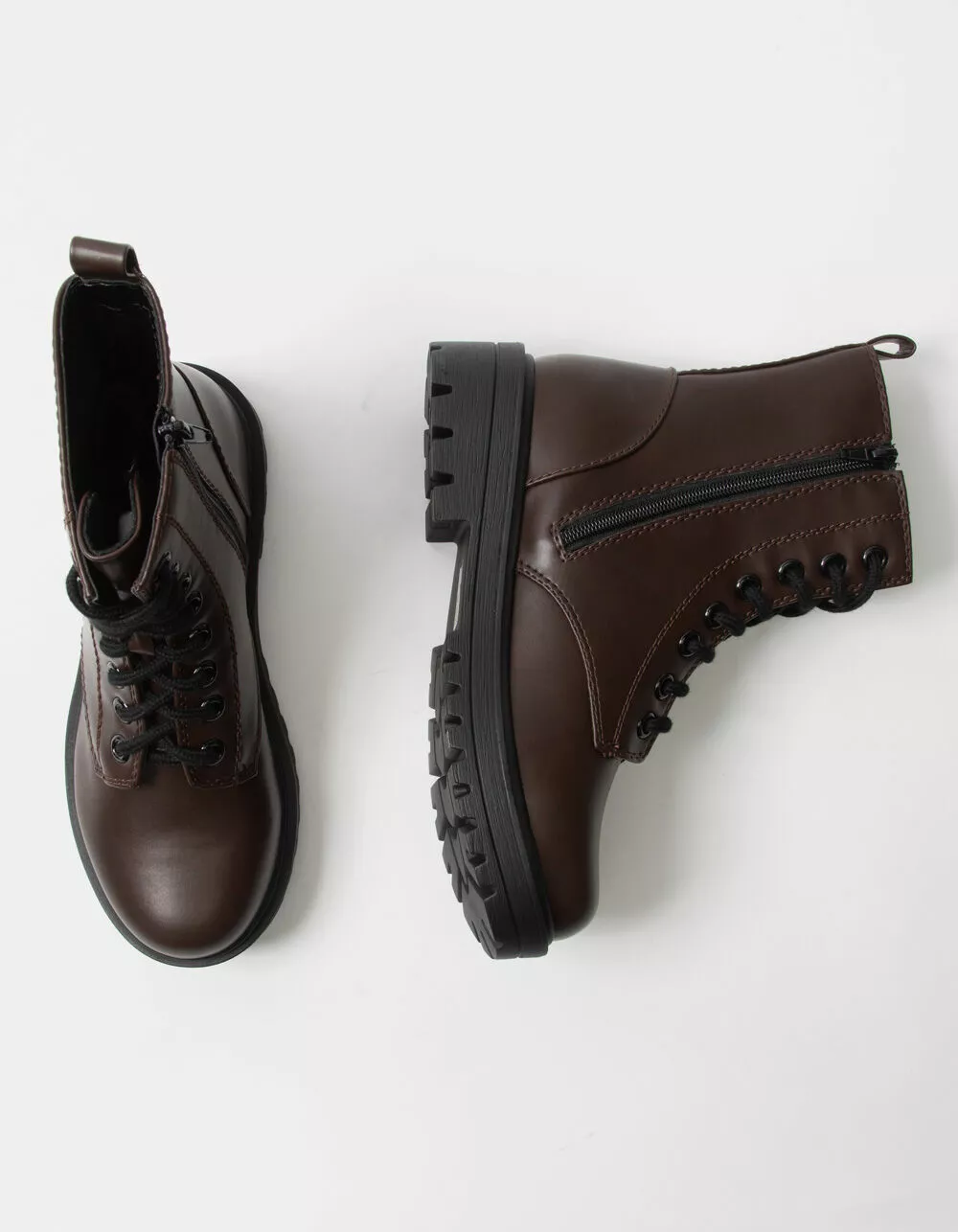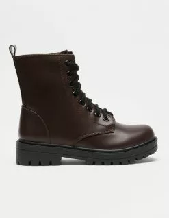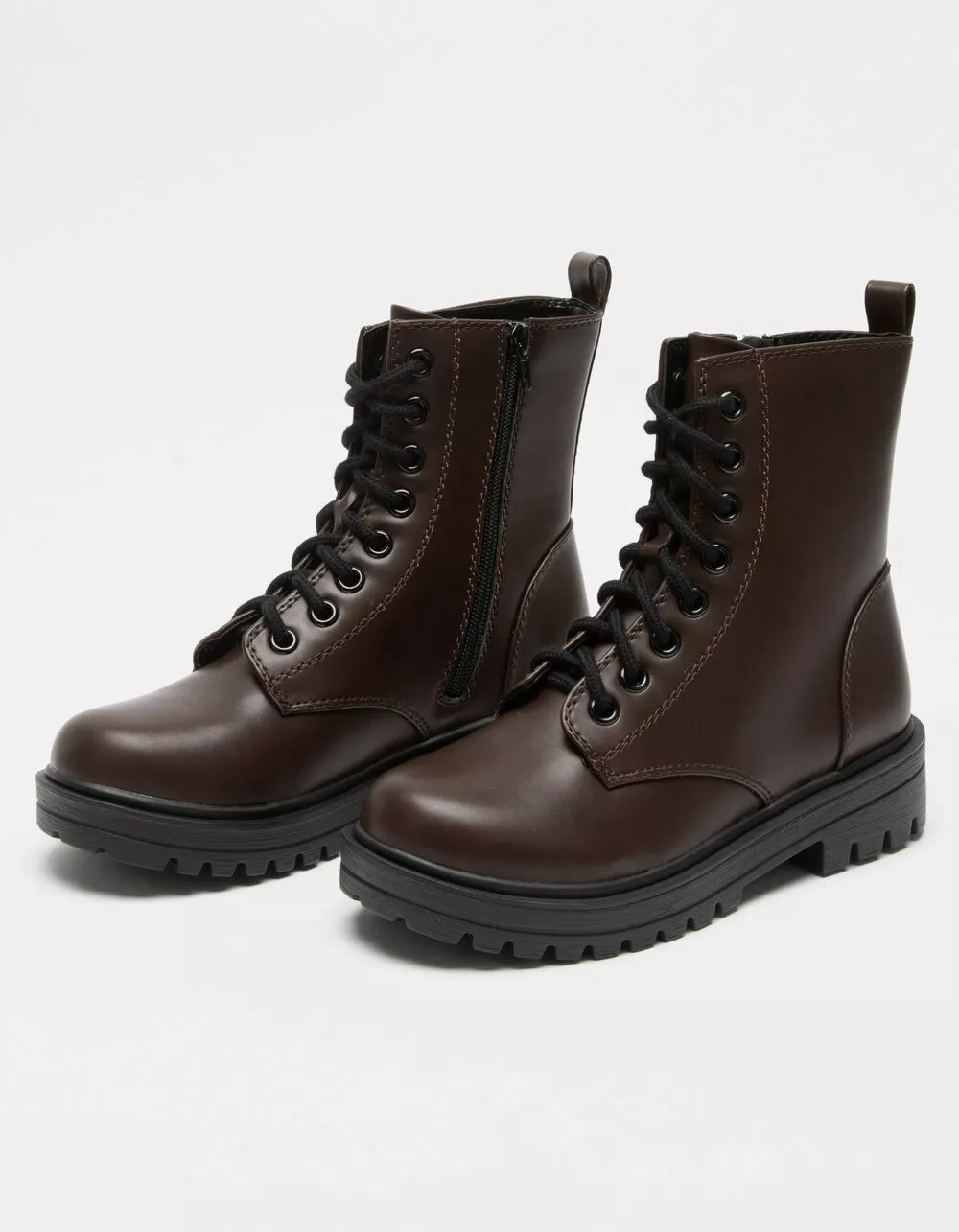 Soda Lug Sole combat boots. Faux leather combat boots. Lace up with an inner zip for easy on and off. Synthetic lug sole. Imported.