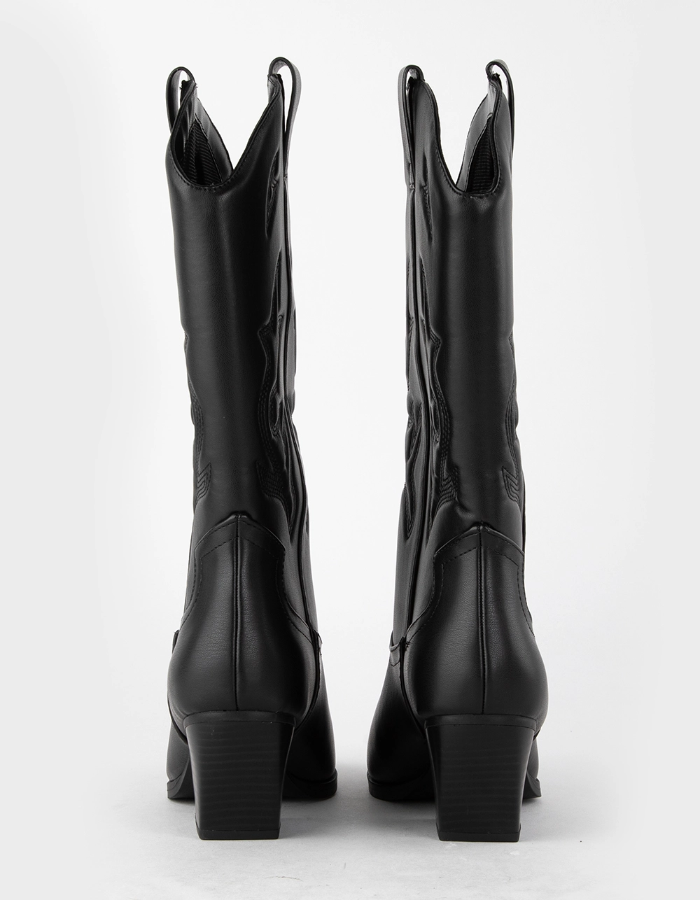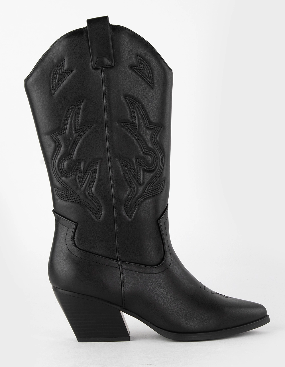 Soda Orville Western Boots. Faux leather boots with western stitch detailing. Pointed toe. Synthetic outsole. Stacked heel. Pull tabs for easy on and off. Mid-calf boots. Approx. heel height: 3″. Imported.