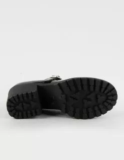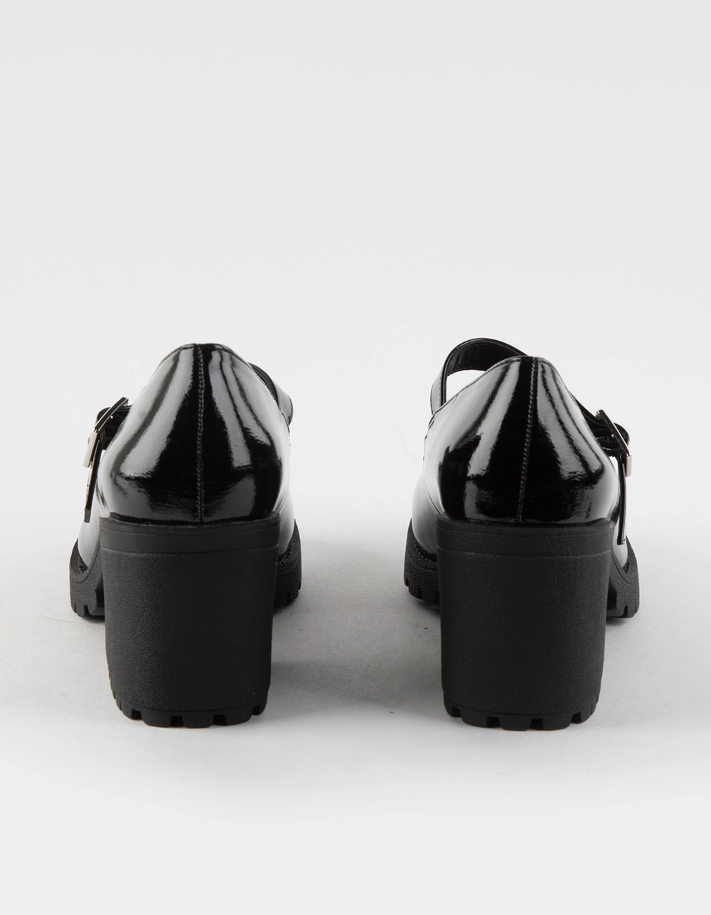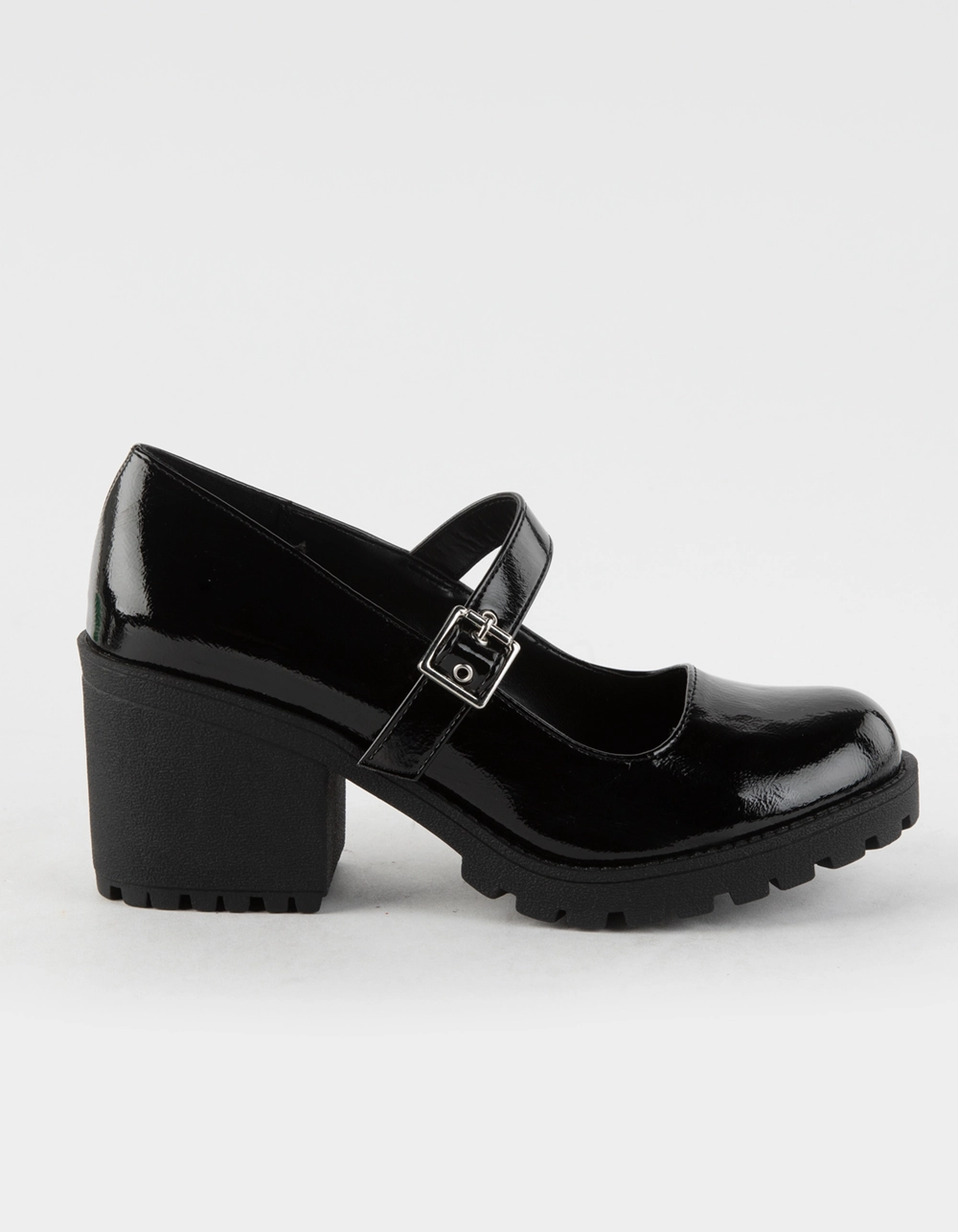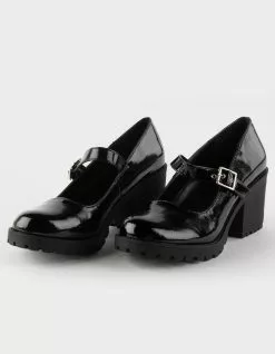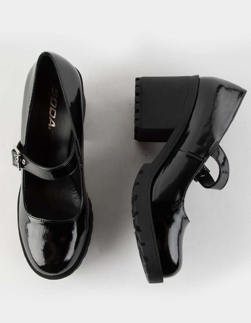Soda Patent Eviana Mary Jane Shoes. Classic Mary Jane silhouette. Buckled strap. Platform heel. Tread pattern on outsole. Heel Height: 3″. Imported.