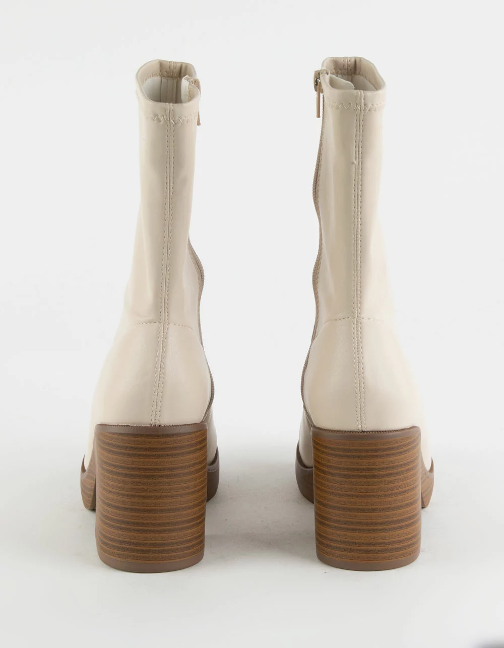 Soda Stretch Boots. Round toe. Inner zip for easy on and off. Faux leather. Approx. heel height: 3.5″. Imported.