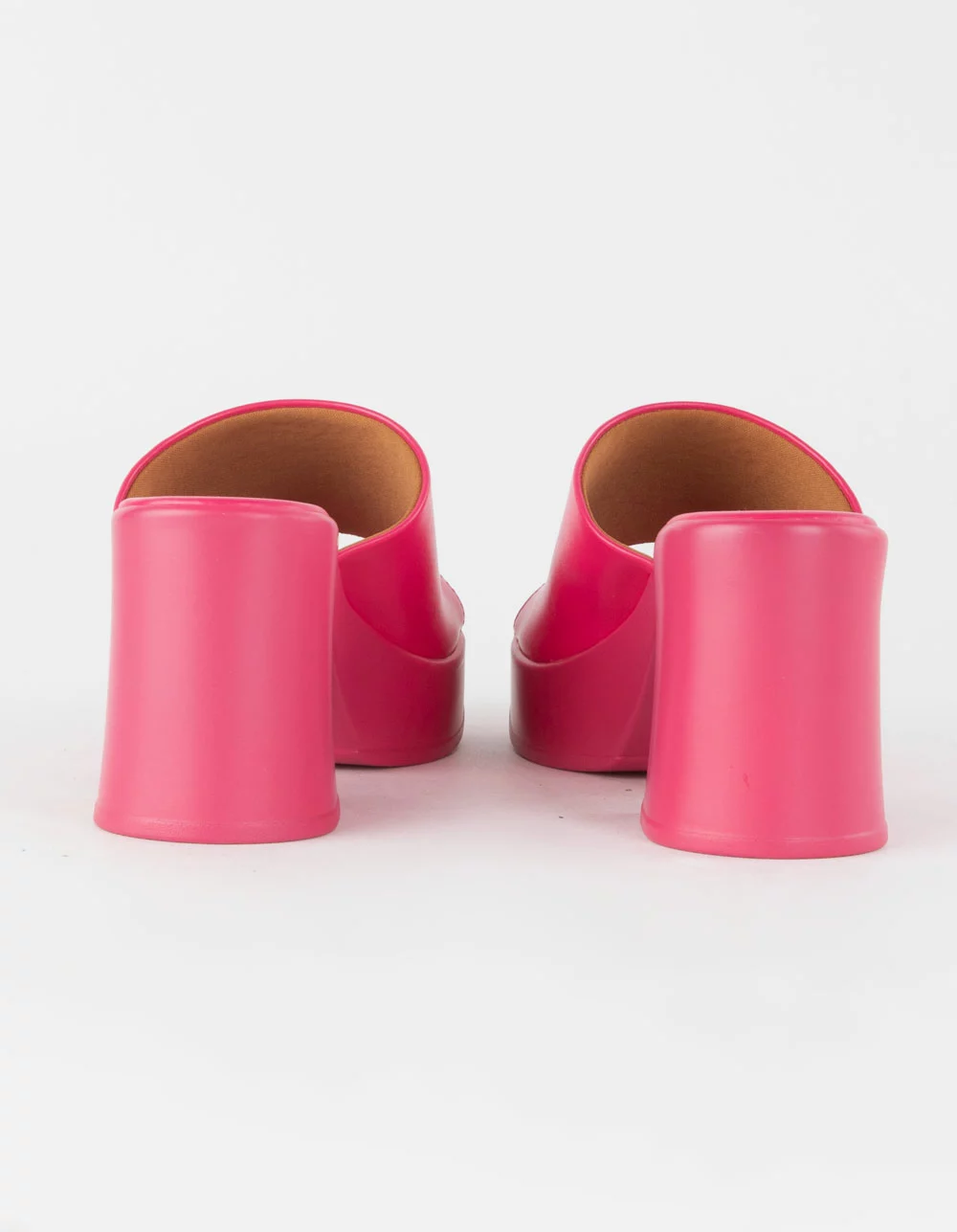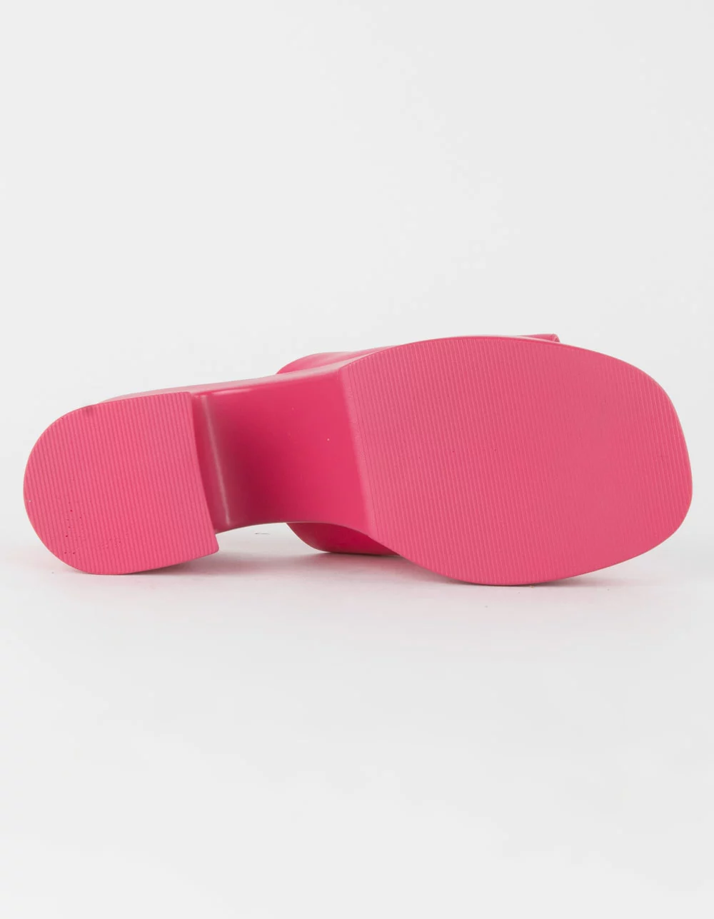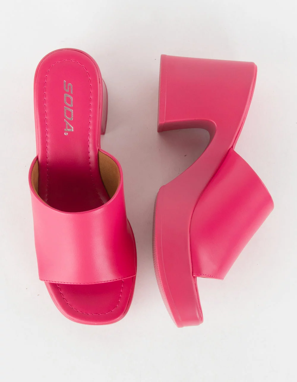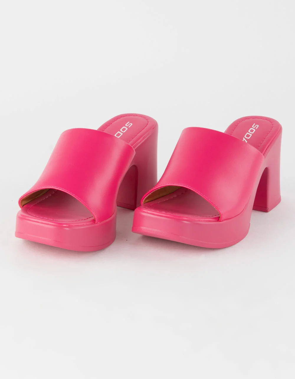 Soda Typo Platform Sandals. Solid color. Synthetic leather upper. Synthetic insole. Slip-on style. Open square toe. Chunky block heel. 3.5 inch block heel height. 1.25 inch platform height. Imported.