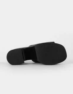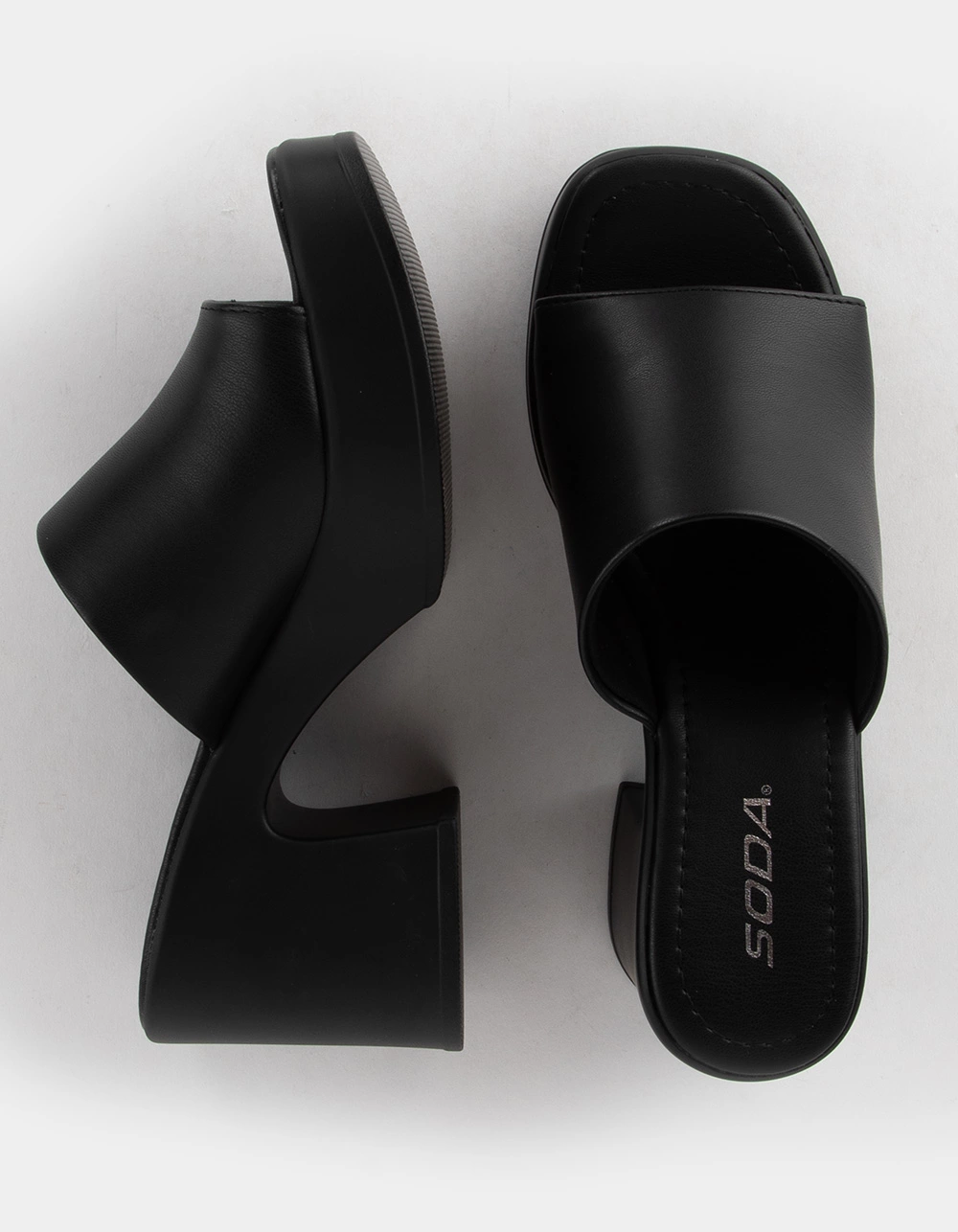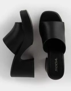 Soda Typo Platform Sandals. Solid color. Synthetic leather upper. Synthetic insole. Slip-on style. Open square toe. Chunky block heel. 3.5 inch block heel height. 1.25 inch platform height. Imported.