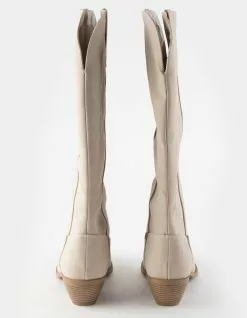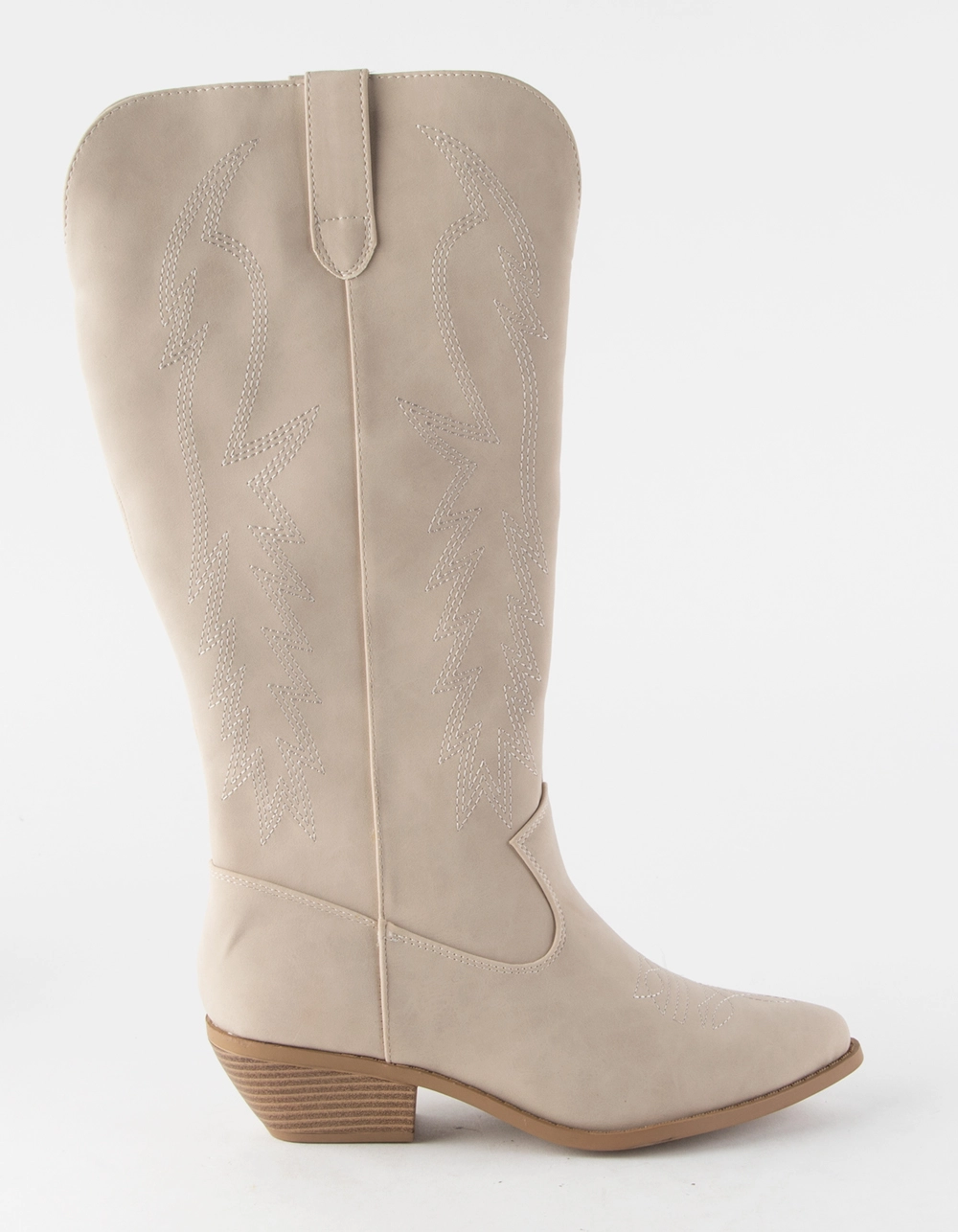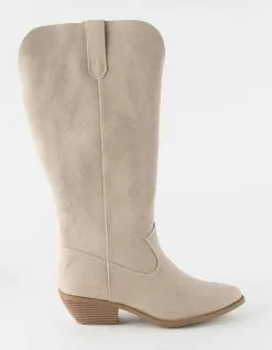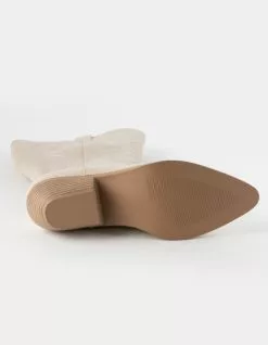 Soda Cowboy Western Boots. Faux Nubuckcowboy boots with stitch detailing. Pointed toe. Synthetic outsole. Stacked heel. Approx heel height: 2″. Imported.
