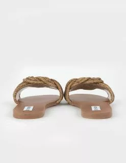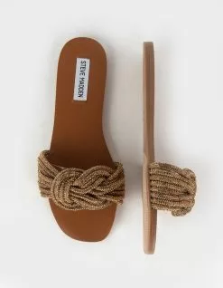 Steve Madden Adore Sandals. The Adore sandals are a flat slide design with a wide front strap made up of shimmering embellished cords in a flat square knot. Slip-on style. Heel height: .25”. Textile upper material with rhinestones. Vegan leather lining. Synthetic sole. Imported.