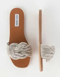 Steve Madden Adore Sandals. The Adore sandals are a flat slide design with a wide front strap made up of shimmering embellished cords in a flat square knot. Slip-on style. Heel height: .25”. Textile upper material with rhinestones. Vegan leather lining. Synthetic sole. Imported.