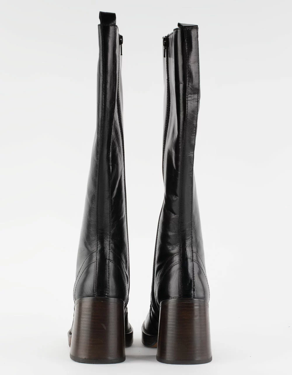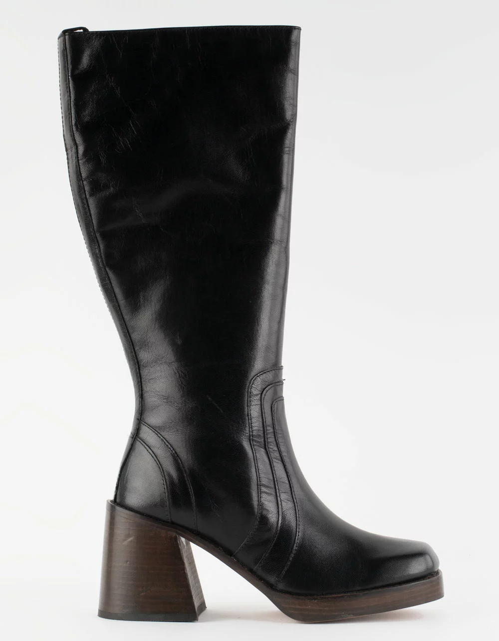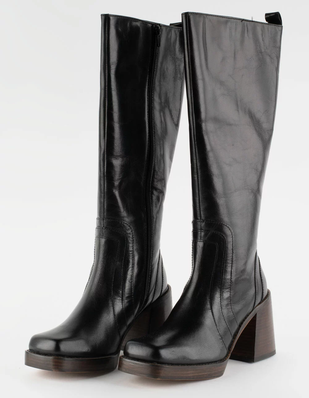 Steve Madden Andiee Platform Boots. The ANDIEE leather boot is a knee high square toe design finished with a angled stacked heel and decorative stitching. Zipper closure at side. Stacked block heel. Square toe. 3.25 inch heel height. 15.25 inch shaft circumference. 14.25 inch shaft height. Leather upper material. Textile and synthetic lining. Synthetic sole. Imported.