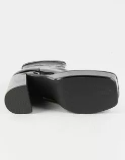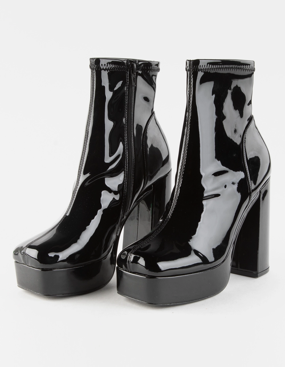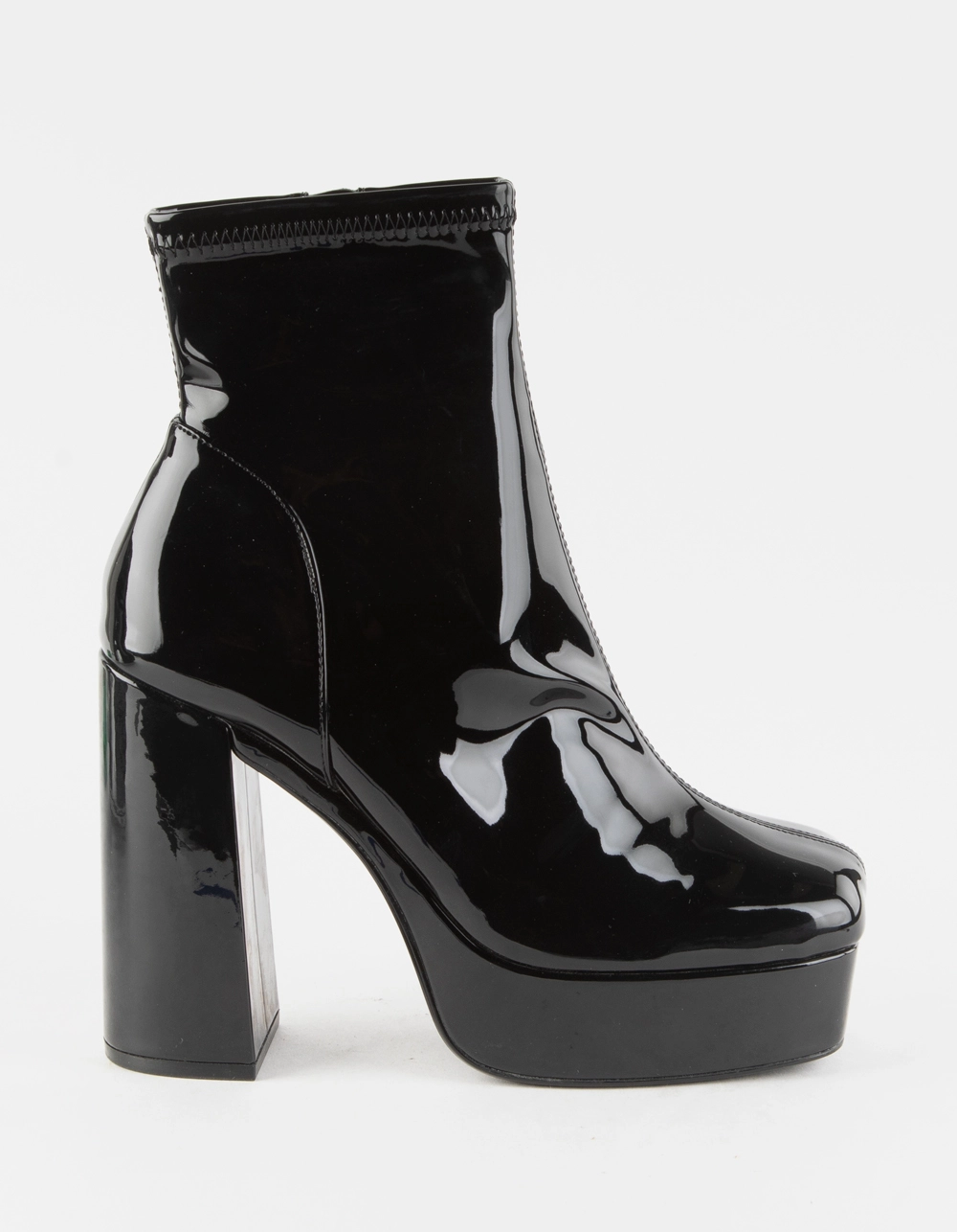 Steve Madden Bianca Patent Platform Boots. Patent synthetic upper. Zipper closure. Synthetic lining. Synthetic outsole. Approx. 1.5″ platform height. Approx. 5″ heel height. Imported.