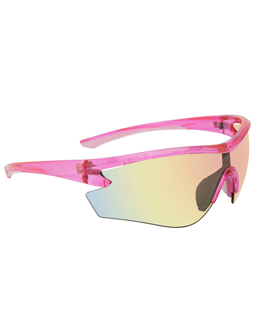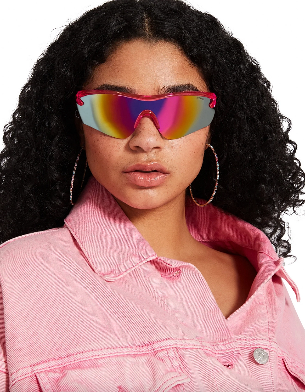 Steve Madden Gabe Sunglasses. Sporty wrap shield sunglasses. Injected polycarbonate front and temple. Polycarbonate lens. Eye/bridge/temple width: 140/0/128(mm). Imported.