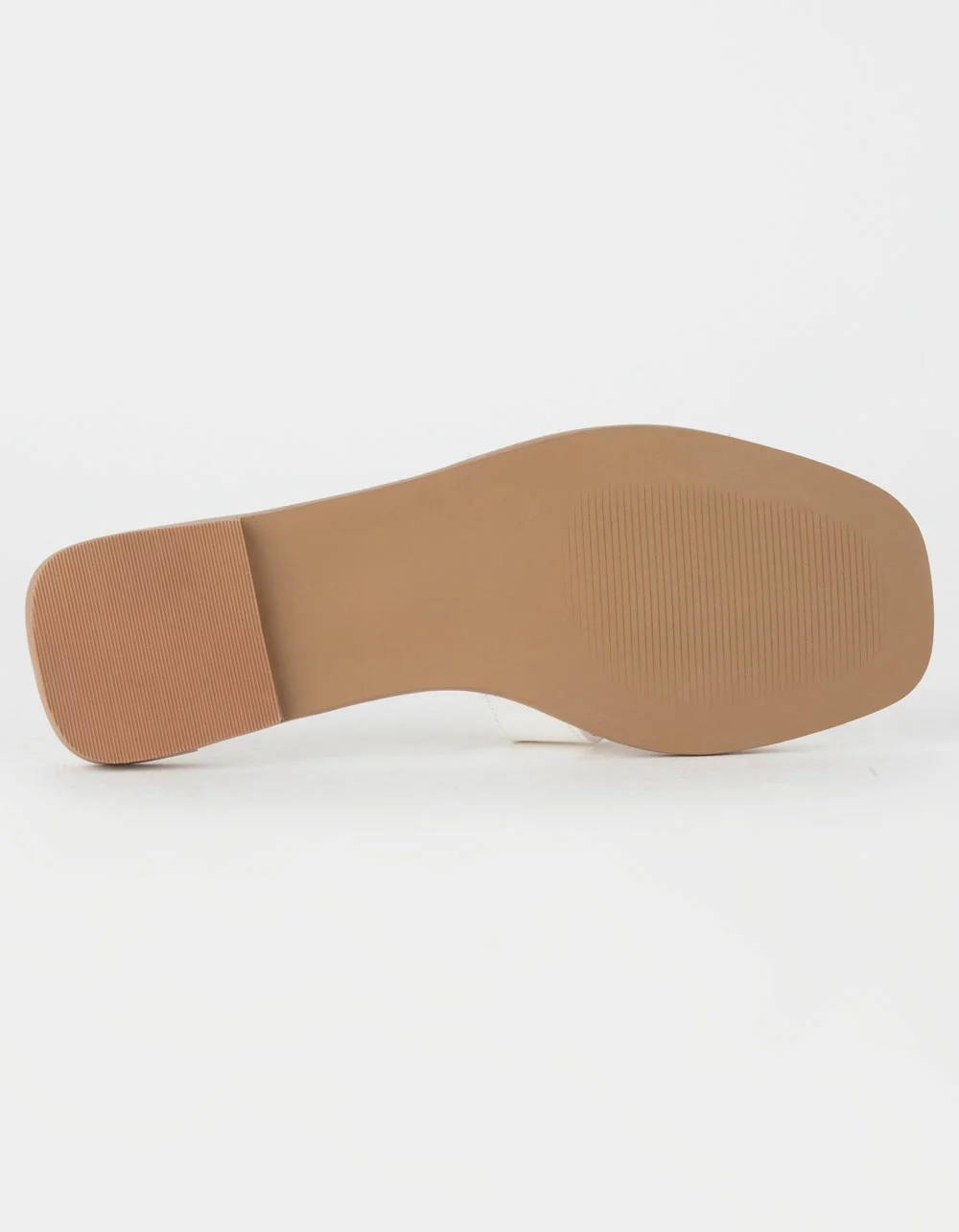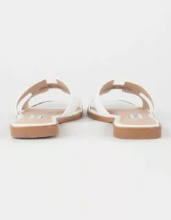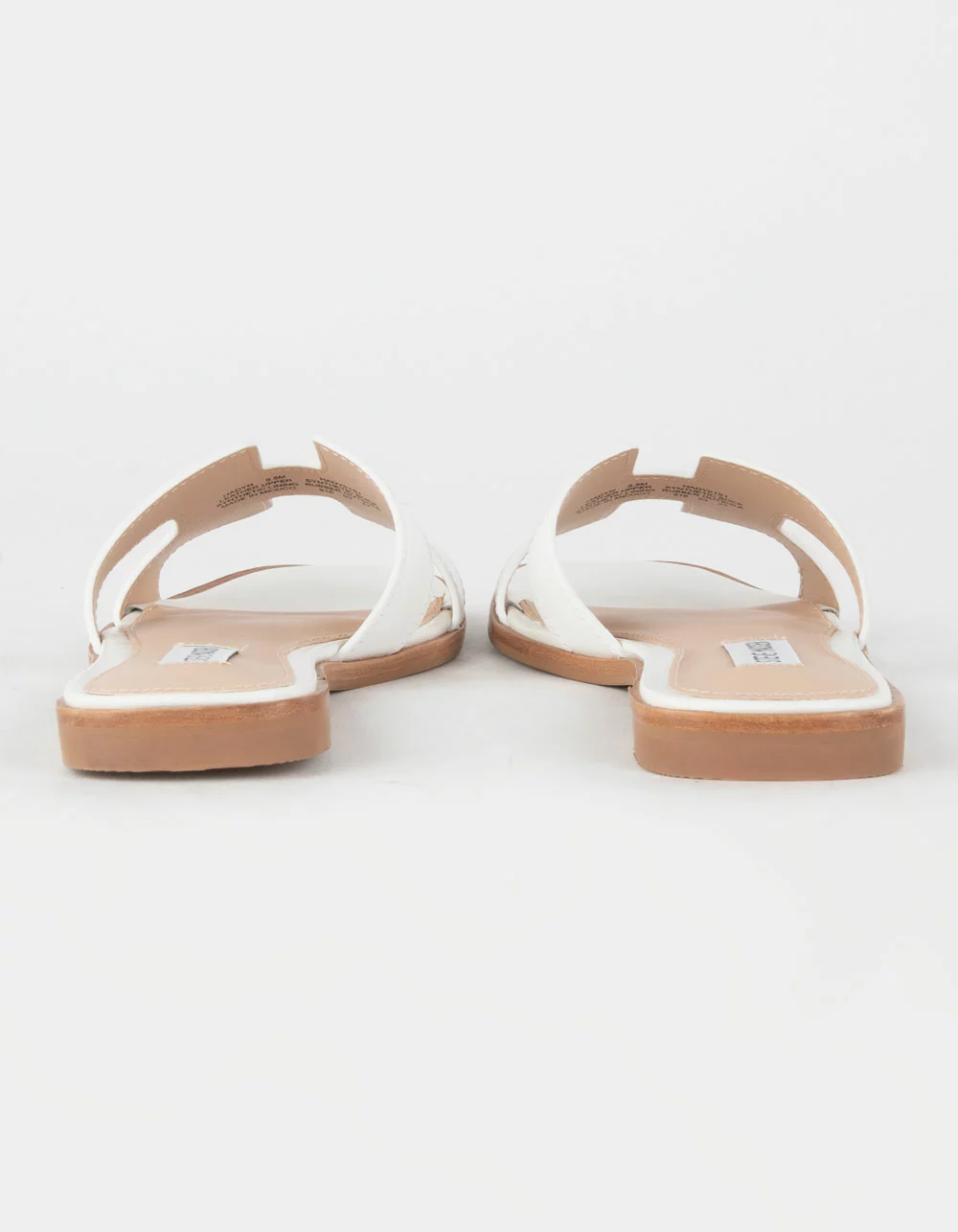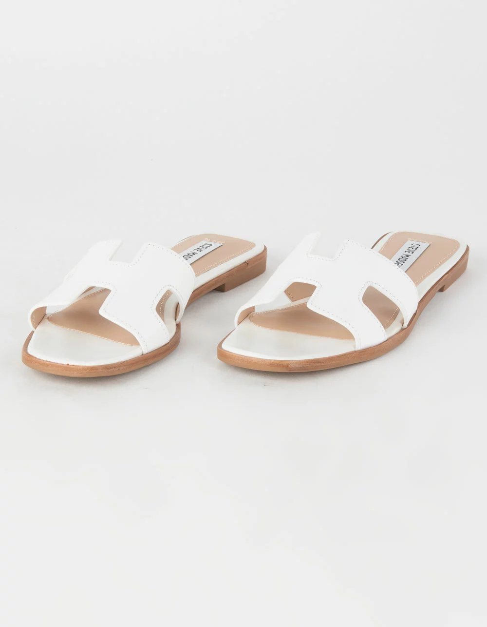Steve Madden Hadyn Sandals. Geometric cutouts on the wide single strap of the Hadyn slide give this flat sandal design a fresh feel. Slip-on style. Leather upper material. Synthetic lining. Synthetic sole. Imported.