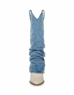Steve Madden Lassy Fold Over Western Boots. Decorative stitching and faux snake accents give the Lassy knee boots a Western edge with a point toe and an angled heel to complete the theme. The foldover construction adds a slouchy style to these knee high boots. Foldover western knee boot. Slip-on style with side pull loops. Angled block heel. 3.5 inch heel height. Leather and synthetic upper material. Textile and synthetic lining. Synthetic sole. Imported.