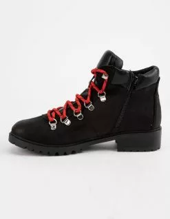 Steve Madden Lora combat boots. In the market for new hikers? LORA is the bootie for you! This cutie delivers an iconic outdoorsy look and a bit of extra height via a slightly taller-than-usual heel. Leather or patent leather upper material. Functional inside zipper. Round toe. Includes an additional pair of black laces. Stacked heel. 1.5 inch heel height. 10.5 inch shaft circumference. 3.5 inch shaft height. Imported.