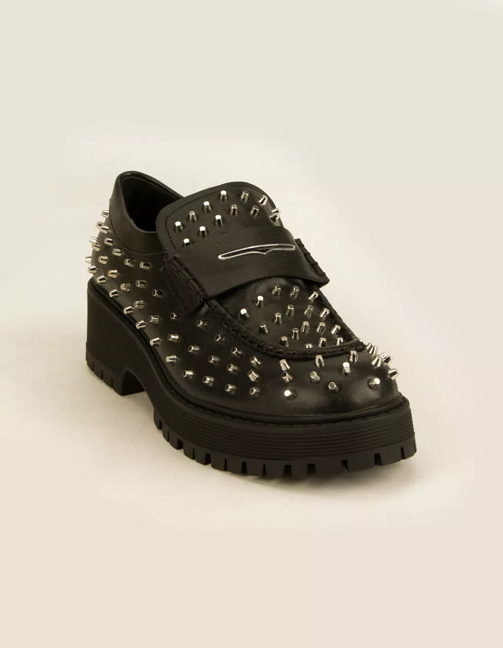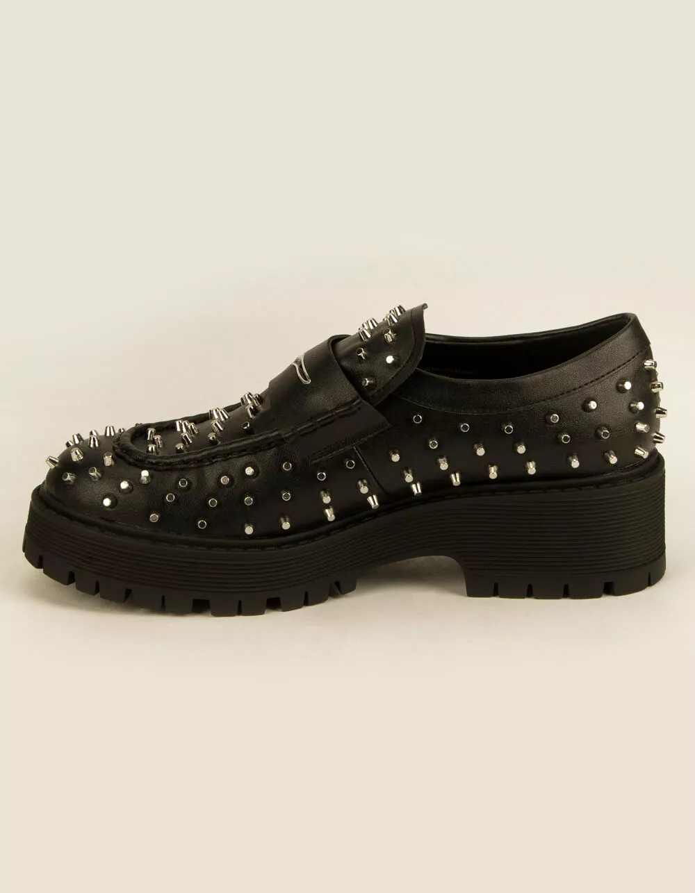 Steve Madden Malvern Studded Loafers. Meet MALVERN — a playfully proportioned update on the classic penny loafer. This slip-on’s ultra-chunky treaded sole provides added support and durability. Allover silver spiked studs. Vegan leather upper. Rubber platform sole. Padded insole. Heel height: 2″. Platform height: 1″. Imported.