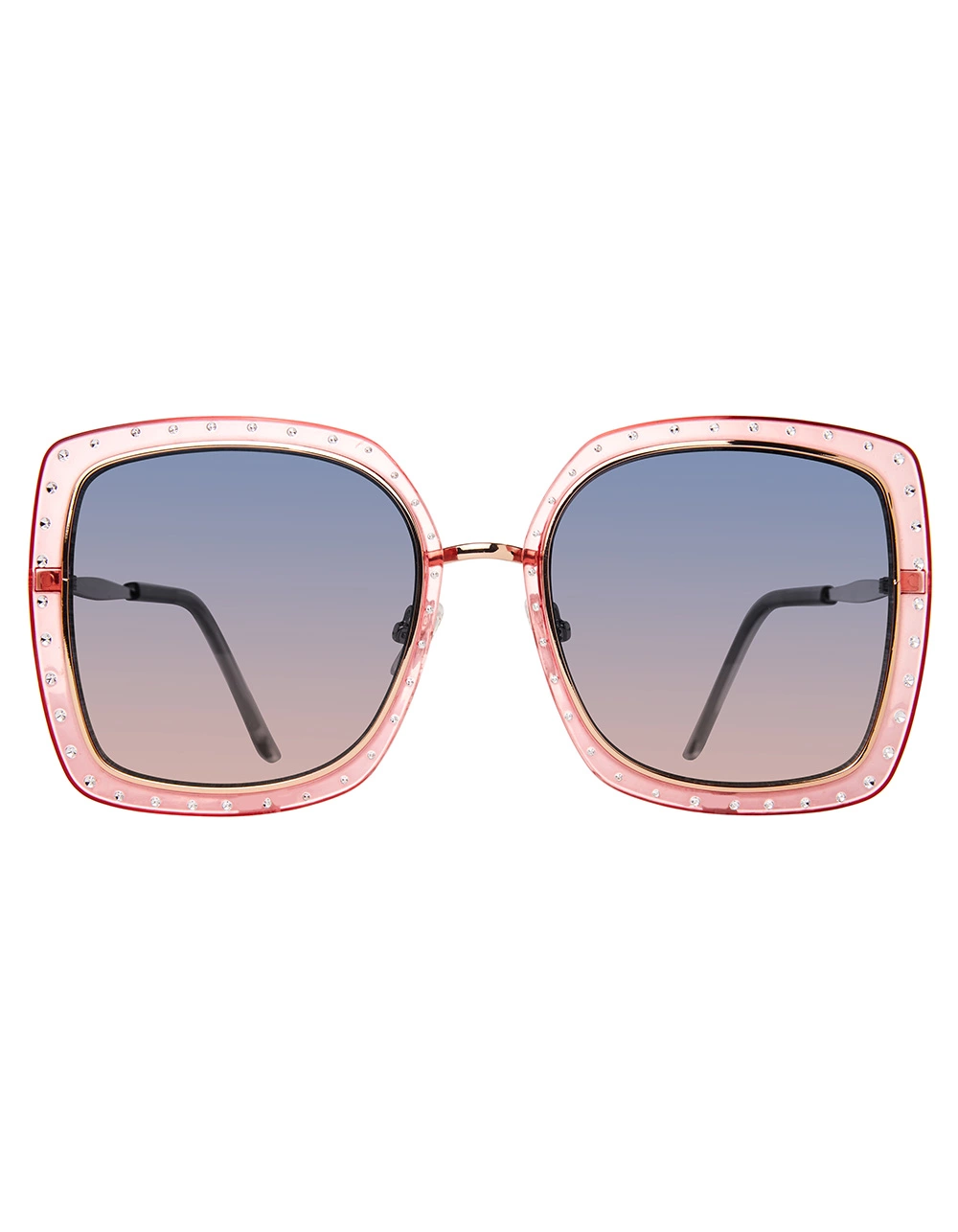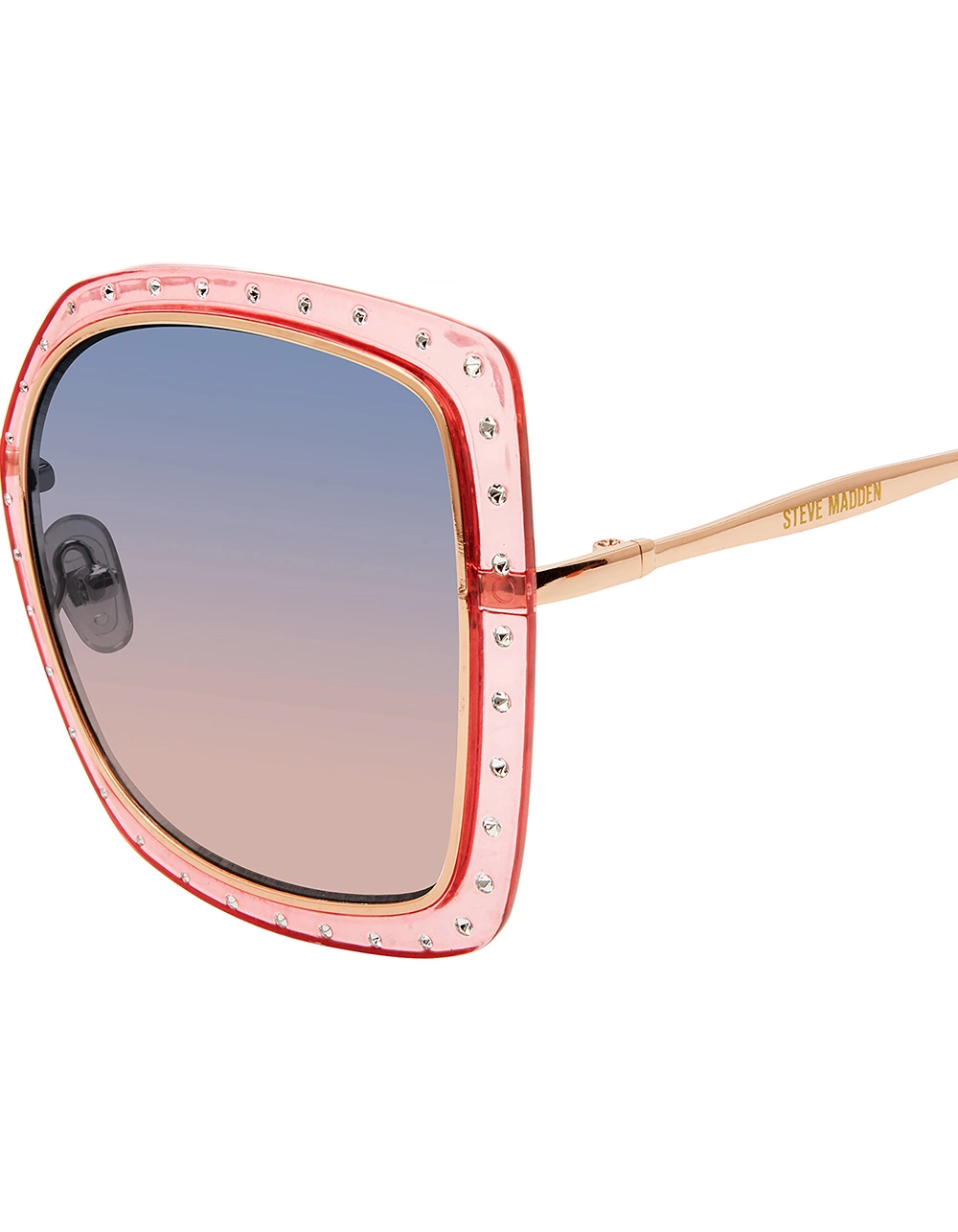 Steve Madden Rosalie Sunglasses. Oversized square sunglasses with bling frame. Injected PC front. Metal temple. Acrylic lens. 100% UV protection. Eye/Bridge/Temple width: 57/21/144(mm). Includes a microfiber bag. Imported.