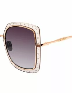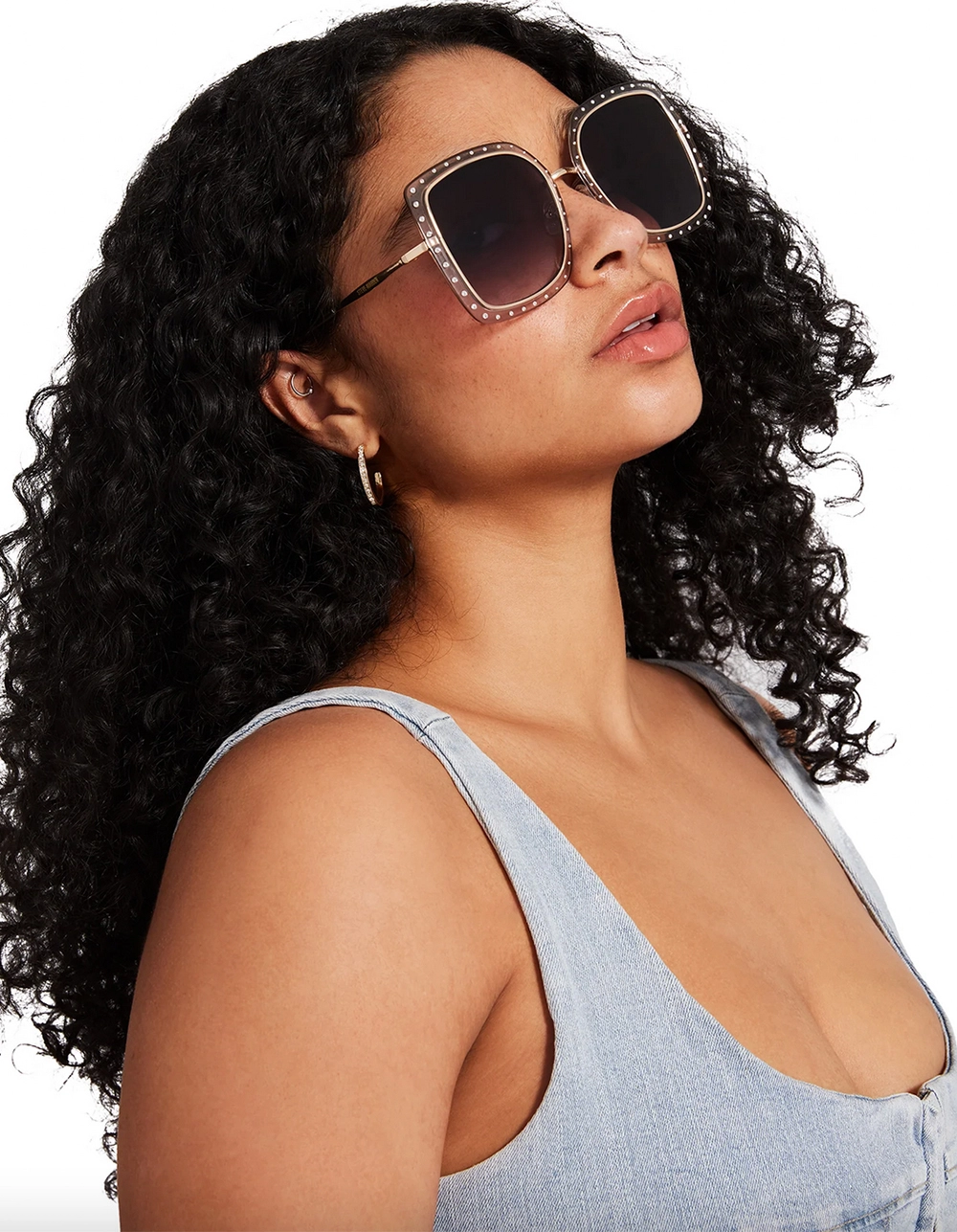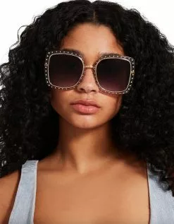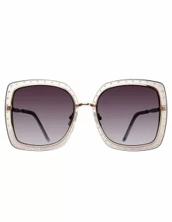 Steve Madden Rosalie Sunglasses. Oversized square sunglasses with bling frame. Injected polycarbonate front. Metal temple. Acrylic lens. Eye/bridge/temple width: 57/21/144(mm). Imported.