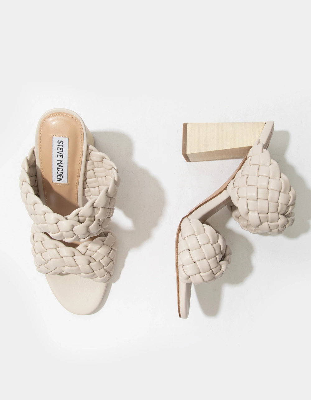 Steve Madden Twisted Heels. Meet the slide that everyone’s lusting for this season. Ultra-chunky braided straps create a rich look and foot-hugging fit, while a tall stacked heel lifts and supports. Vegan leather upper material. Vegan leather lining. Synthetic sole. Synthetic sole. Imported.