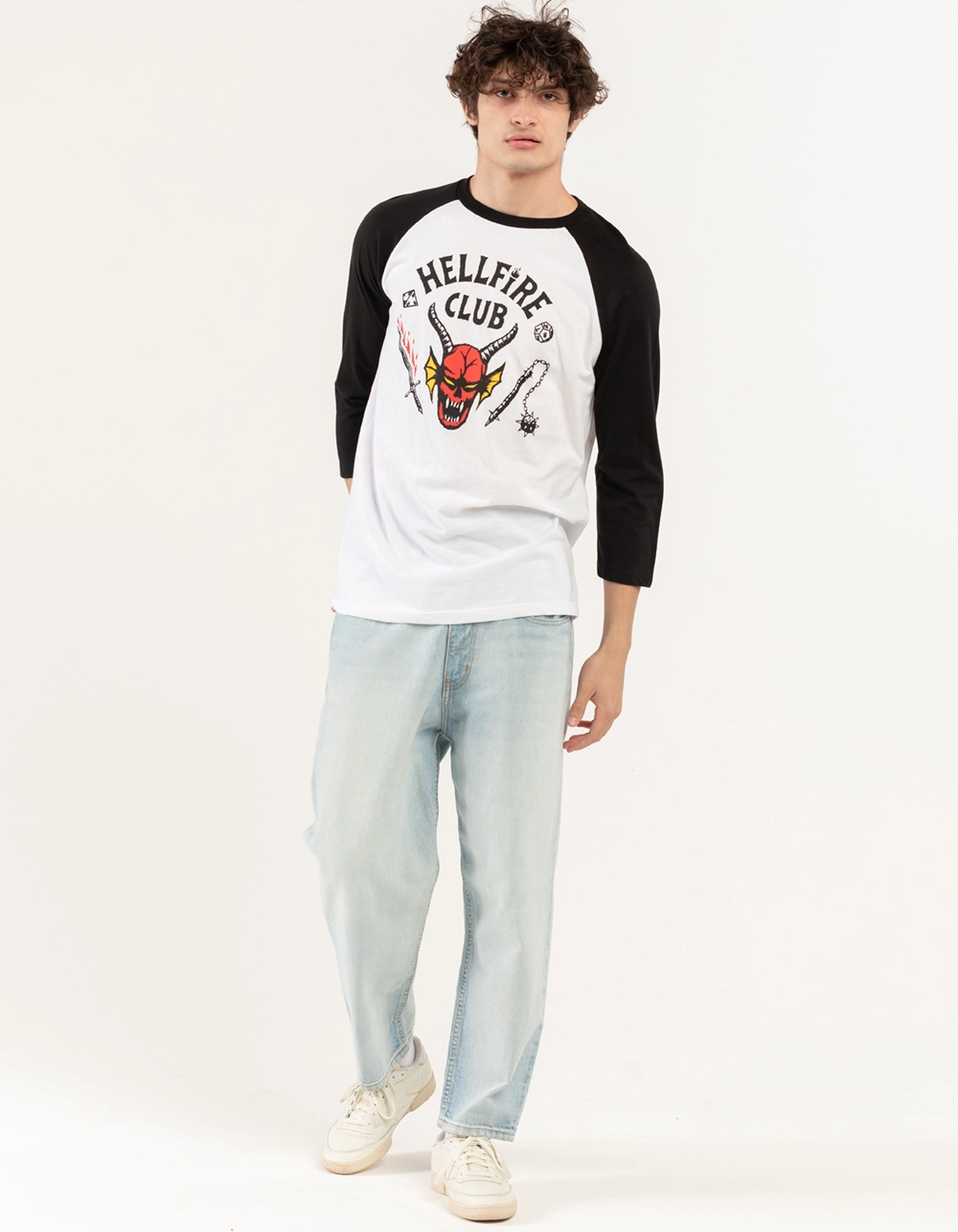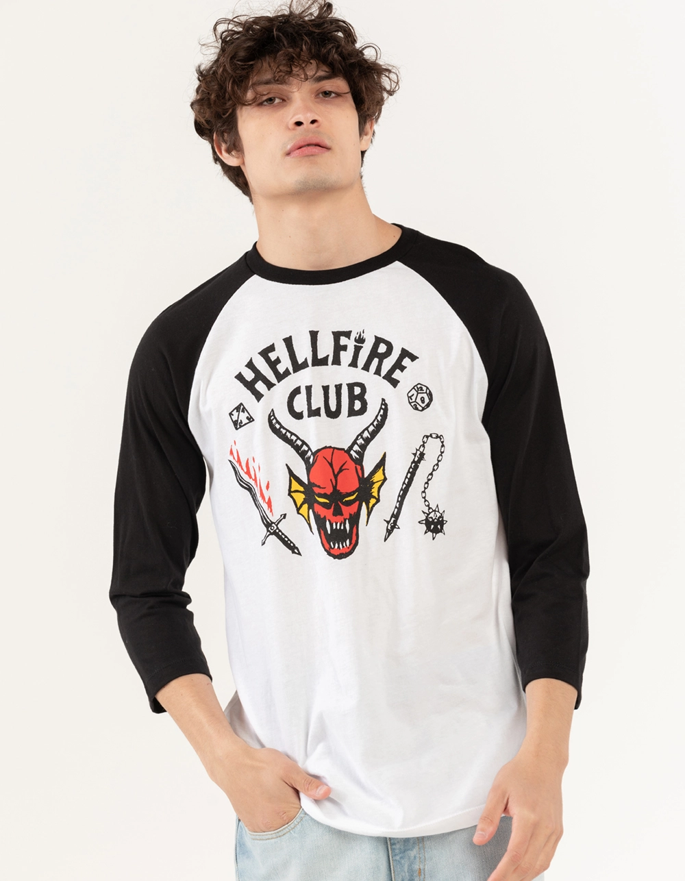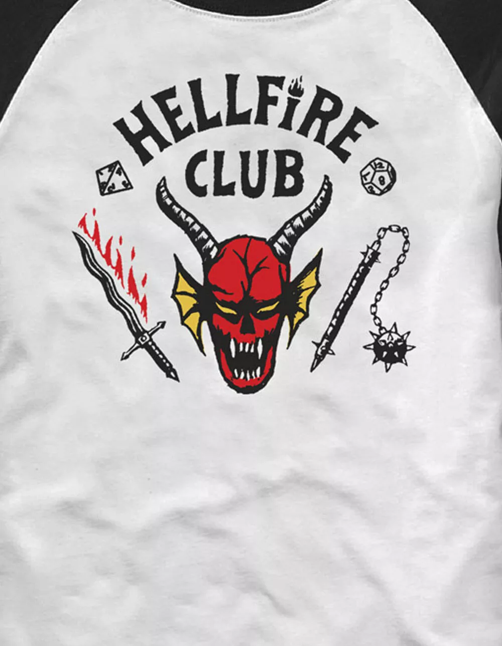 Stranger Things Hellfire Club Raglan Tee. Turn your world upside down with this officially licensed Stranger Things Season 4 Baseball Tee! Your favorite 1980s-inspired Netflix television series is taking you back to Hawkins, Indiana to fight Vecna. This retro baseball tee is inspired by the iconic Hellfire Club uniform and showcases dice, swords, and a horned demon across the front. 100% Cotton. Prewashed for minimum shrinkage. Machine washable. Printed in the U.S.A. This item is unisex fit and sizing.