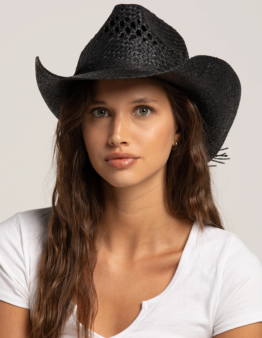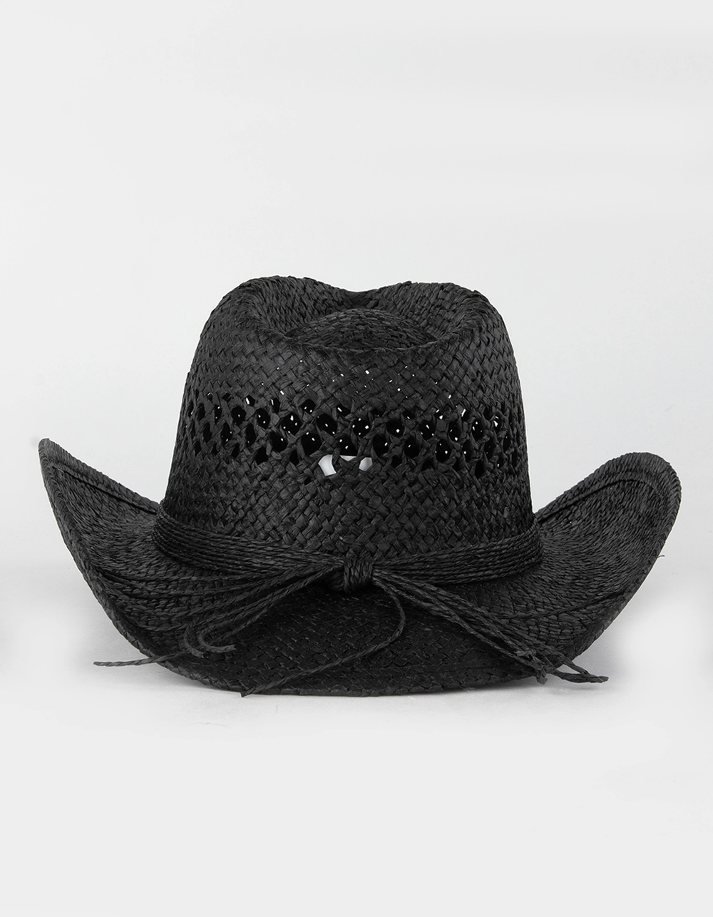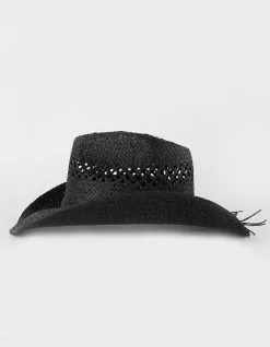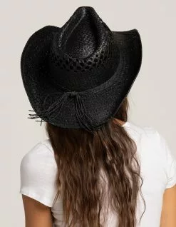 Straw String Trim Cowboy Hat. High crown with pinch front. Wide brim. Straw tassel tied around brim of hat. Adjustable strap inside. 100% Straw. Imported.