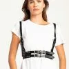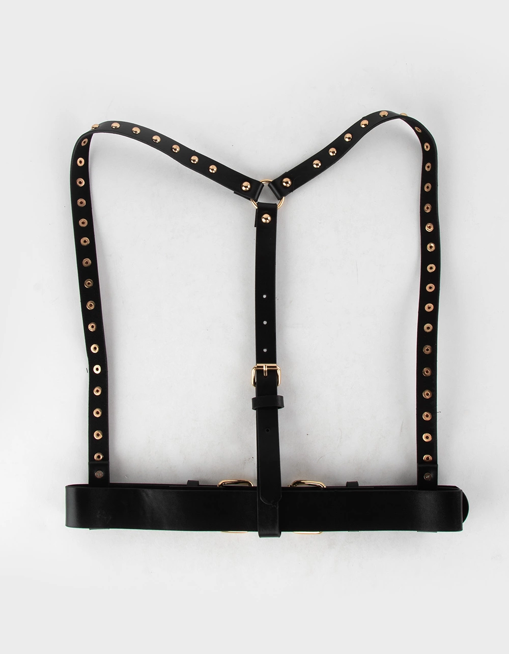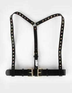 Studded Harness Belt. Looking for a belt that’s equal parts chic and fierce? Check out the Studded Harness Belt! With its bold studded design and harness style, this belt is the ultimate accessory for anyone who wants to make a statement. Adjustable buckle at back and waist. Gold tone stud detailing. 100% Polyurethane. Imported.