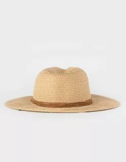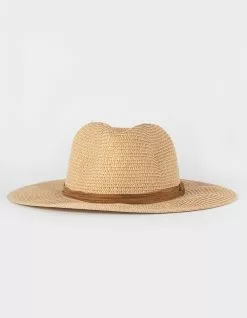 Suede Trim Straw Fedora Hat. Pinch crease front straw fedora hat. Wide brim. Braided suede hatband. Elastic band in the interior of the hat. Packable and made to fit in luggage. 100% Paper. Spot clean with a damp cloth. Imported.