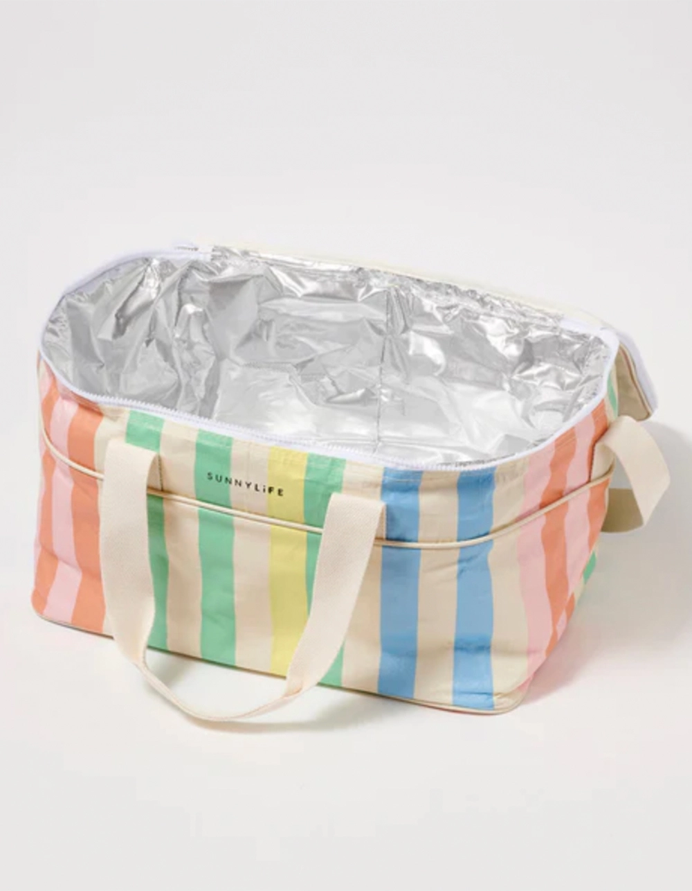 Sunnylife Light Cooler Bag. With the Sunnylife Light Cooler Bag you can keep your cool even on the hottest of days. It’s a classic essential for any occasion. Insulates meals hot or cold for up to 3 hours. Food safe insulated interior. Light weight and durable. Collapsible. Cotton webbing handles. Capacity: 31.5 Liters. Product dimensions: 16.14″ x 11.81″ x 15.75″. Imported.