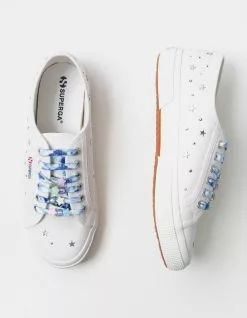 Superga 2750 Star Studs Shoes. Sturdy cotton unlined canvas upper with silver studded stars. Lace-up closure with metal eyelets for an adjustable fit. Loop signature tag at side. Cushioned footbed provides sustained comfort for all-day wear. Natural rubber, crepe-textured outsole offers traction and durability. Platform measures approximately 1″ high. Imported.