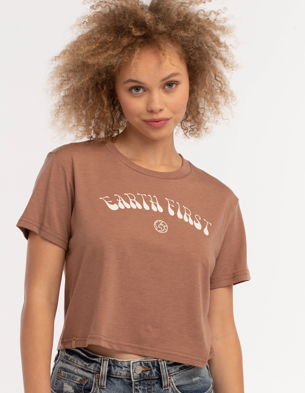 Tentree Earth First Oversized Crop Tee. Graphic on front. Ribbed crew neckline. Crop hem. Short sleeves. 45% Recycled Polyester 30% Tencel Lyocell 25% Organic Cotton. Machine wash. Imported.