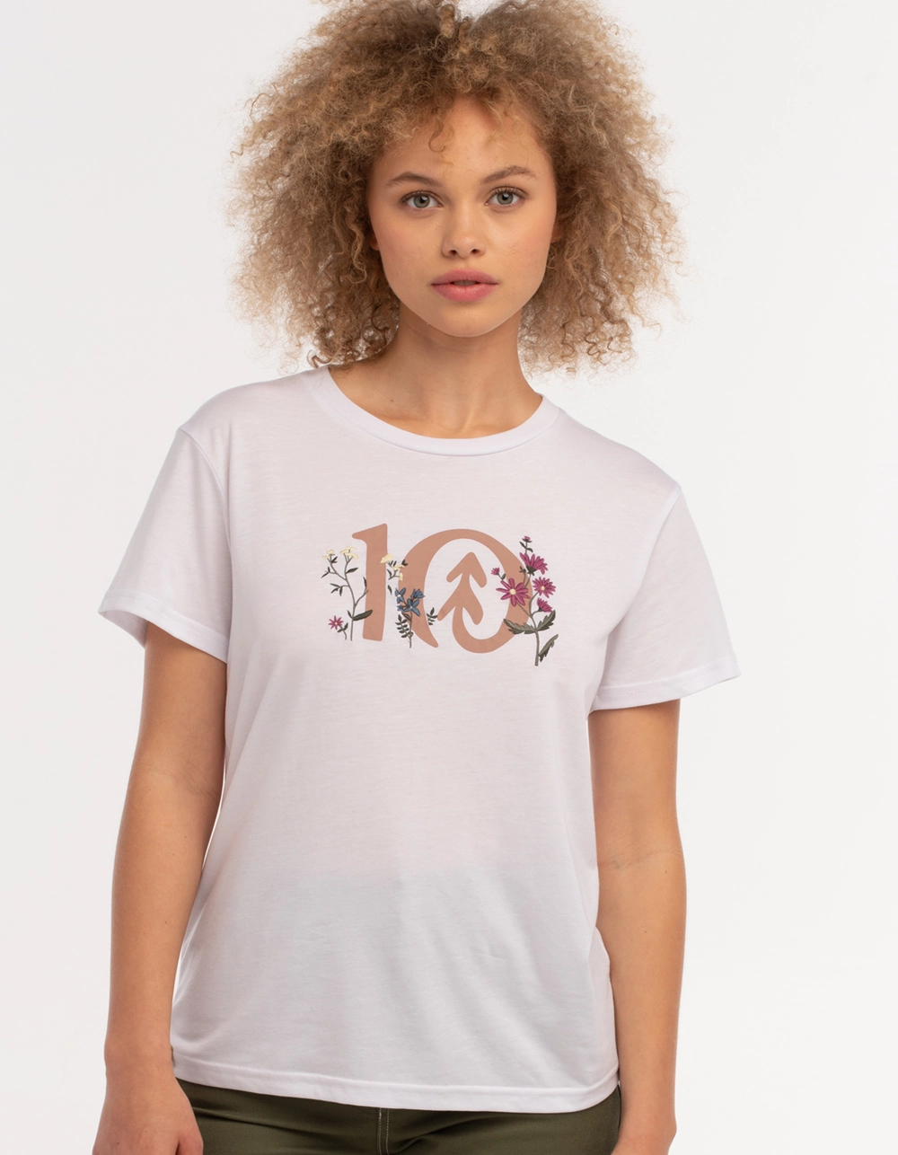 Tentree Floral Logo Tee. Graphic on front. Ribbed crew neckline. Short sleeves. 45% Recycled Polyester 30% Tencel Lyocell 25% Organic Cotton. Machine wash. Imported.