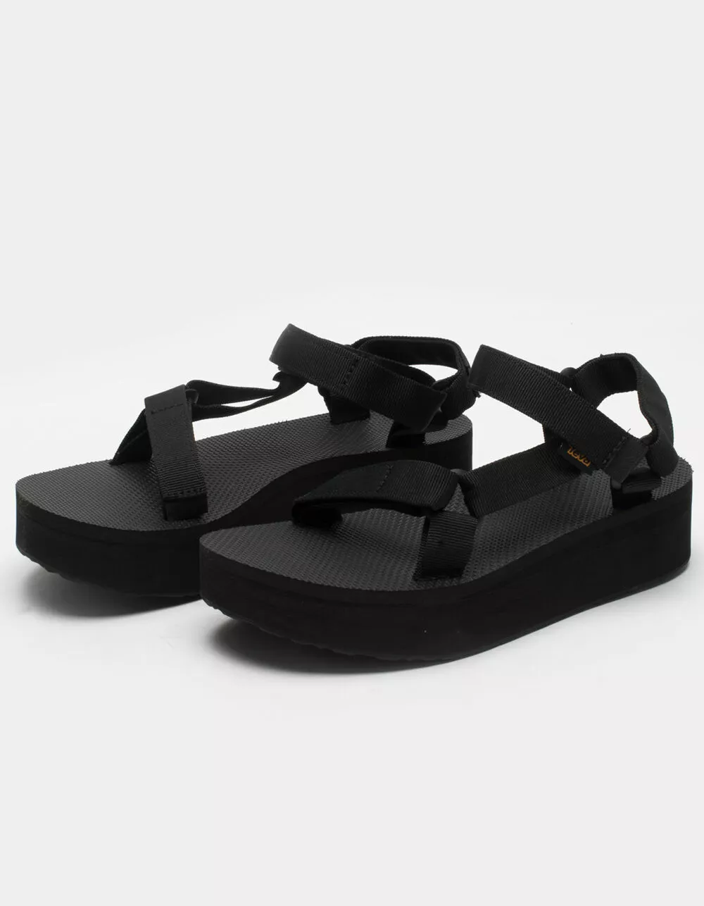 Teva Flatform Universal Sandals. The Flatform Universal takes our iconic Universal to new heights. Finished with earth-friendly Unifi® recycled polyester straps for a sustainable style that makes a statement while keeping plastic out of landfills. Easy hook-and-loop closure. Molded EVA midsole with hell cupping & arch cookie. Rubber outsole. Added Microban treatment. Vegan friendly. Synthetic & plant-based materials. Approx. height: 1.75″. Imported.