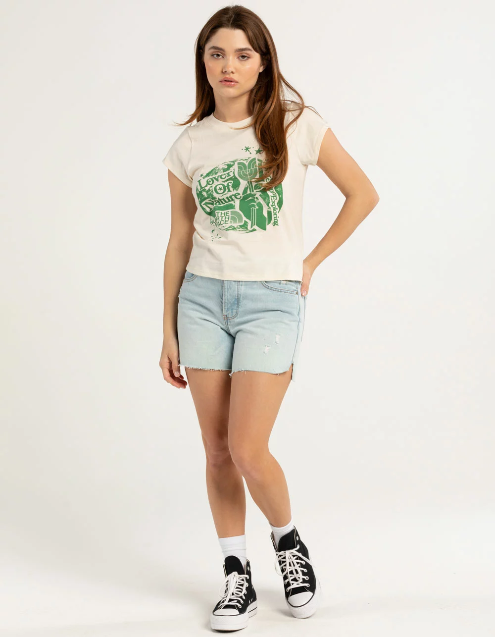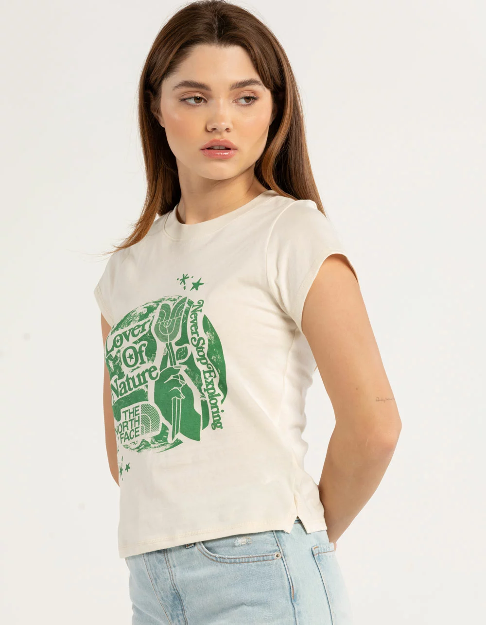 The North Face Earth Day Cutie Tee. Large graphic screened on front. Ribbed crew neckline. Short sleeve. 100% Cotton. Machine wash. Imported.