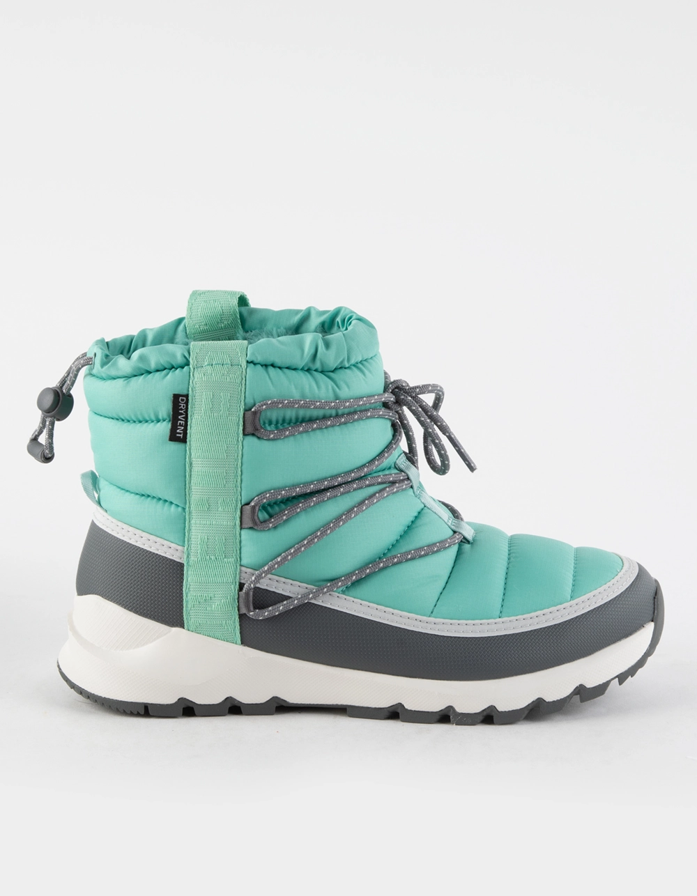 The North Face Thermoball Lace Up Waterproof Boots. The lightweight, waterproof Women’s ThermoBall™ Lace Up Waterproof are secure-fitting winter boots with durable recycled ripstop uppers and toasty ThermoBall™ Eco insulation. Upper: Water-repellent, recycled P.E.T. ripstop upper. Waterproof DryVent™ bootie construction. Non-PFC durable water-repellent (non-PFC DWR) finish to help keep feet dry. Lightweight ThermoBall™ Eco insulation retains warmth even when wet. TNF™-branded webbing pull loops on both sides for easy pull-on. Collar bungee is adjustable to prevent snow from getting in. Synthetic mudguard helps keep the elements out. Oso fleece collar lining for comfort. Comfortable OrthoLite® footbed made with 5% recycled rubber content. Sole Unit Rubber outsole for increased traction. Imported.