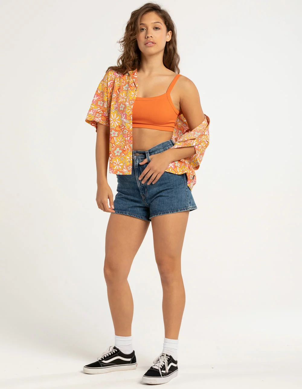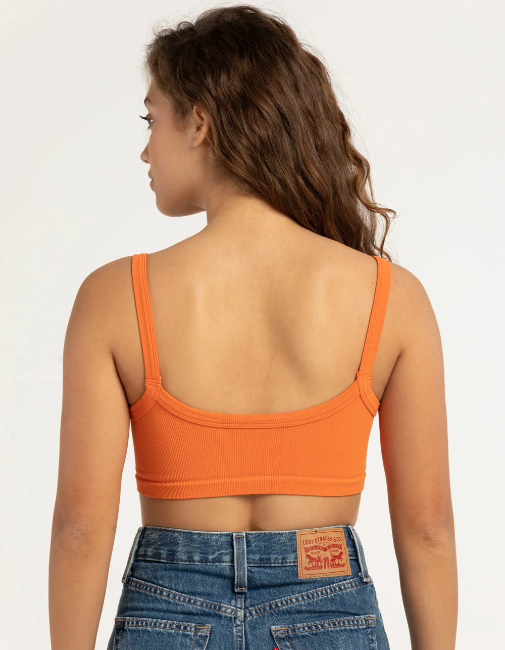 Tilly’s Basic Bralette. Rib knit construction. Scoop neckline. Fixed shoulder straps. Fitted silhouette. Cropped. 92% Nylon, 8% Spandex. Hand wash. Made in USA.