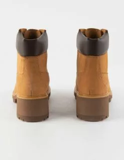 Timberland Kinsley 6″ Waterproof Boots. Designed to fit a woman’s foot and featuring a feminine silhouette, this boot is fully waterproof and offers comfy cushioning underfoot. It’s also responsibly made with eco-conscious leather and linings. Waterproof Better Leather from a tannery rated silver by the Leather Working Group for its water, energy, and waste management practices. Lace-up style. Seam-sealed waterproof construction. Padded collar. ReBOTL™ fabric lining containing at least 50% recycled plastic. OrthoLite® Impressions memory-foam footbed. Midsole of EVA-blend foam for high-rebound cushioning. Rubber lug outsole. Heel Height: 2.25 in. Imported