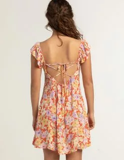 Timing Tie Front Babydoll Dress. Allover floral print. V-neckline. Tie closure at neckline. Elastic shoulder straps. Strappy crossover tie at back. Approx. length: 33.5”. Self: 100% Rayon. Lining: 100% Polyester. Hand wash. Imported.