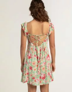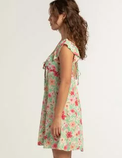 Timing Tie Front Babydoll Dress. Allover floral print. V-neckline. Tie closure at neckline. Elastic shoulder straps. Strappy crossover tie at back. Approx. length: 33.5”. Self: 100% Rayon. Lining: 100% Polyester. Hand wash. Imported.