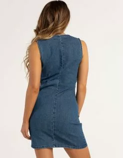 Tinseltown Cutout Denim Dress. Scoop neckline. Side seam zipper entry. Cutout on left waist to expose midriff. Sleeveless. Approx. length: 33.5”. 70% Cotton, 29% Polyester, 1% Spandex. Machine wash. Imported.