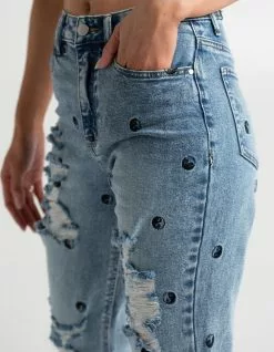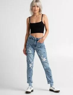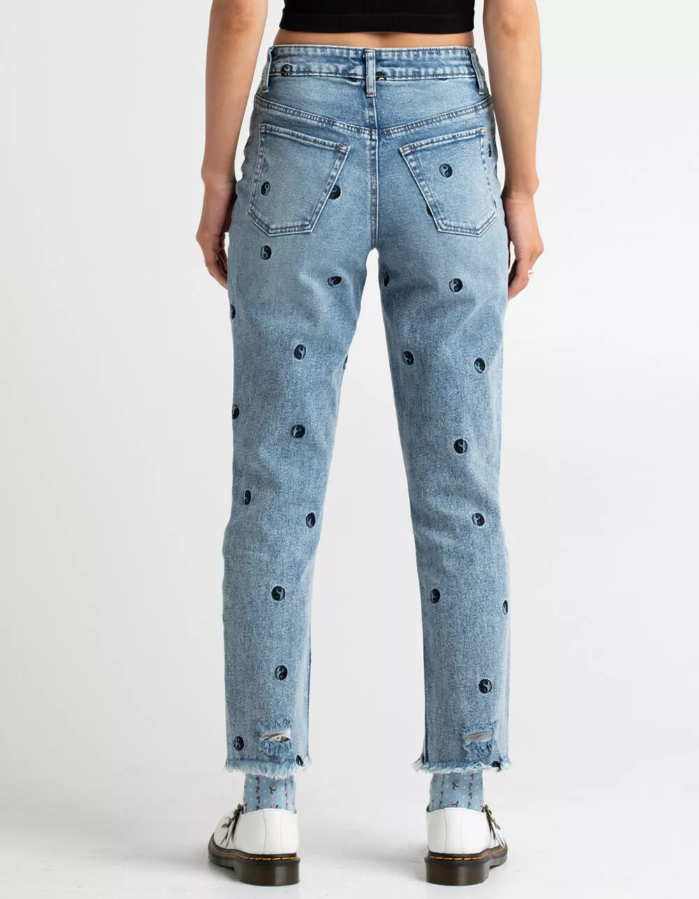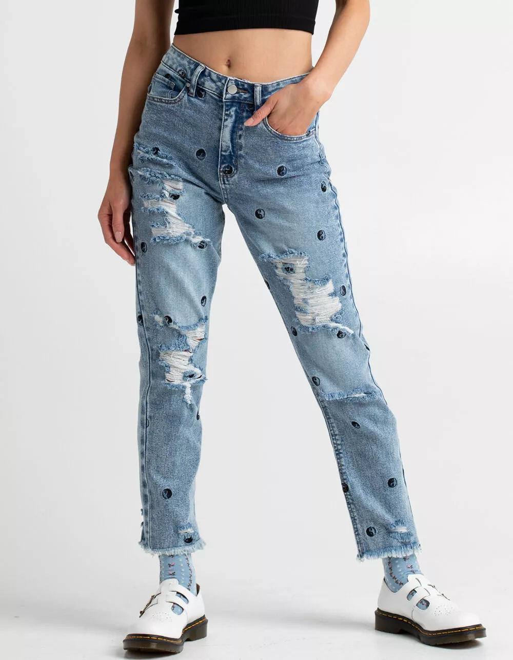 Tinseltown Yin And Yang Mom Jeans. All over patches. Belt loop waist. High waisted. Tapered leg. Raw hem. Button closure paired with zipper fly. Basic 5 pocket design. Custom rips. Approx. inseam: 27″. 99% Cotton 1% spandex. Machine wash. Imported.