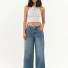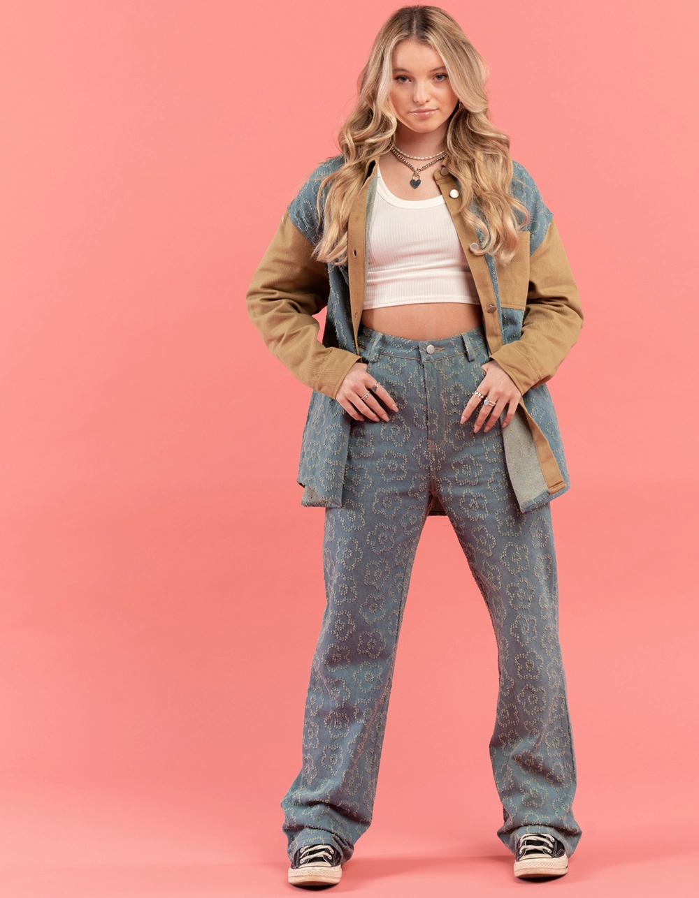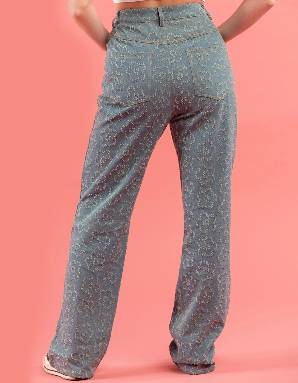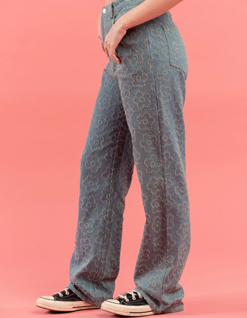 TrueWrld Floral Distress Jeans. All over floral distress pattern. Belt loop waist. Button closure paired with zipper fly. Rounded hand pockets. Back patch pockets. High rise. Straight leg. Approx. inseam: 31″. 100% Cotton. Machine wash. Imported.
