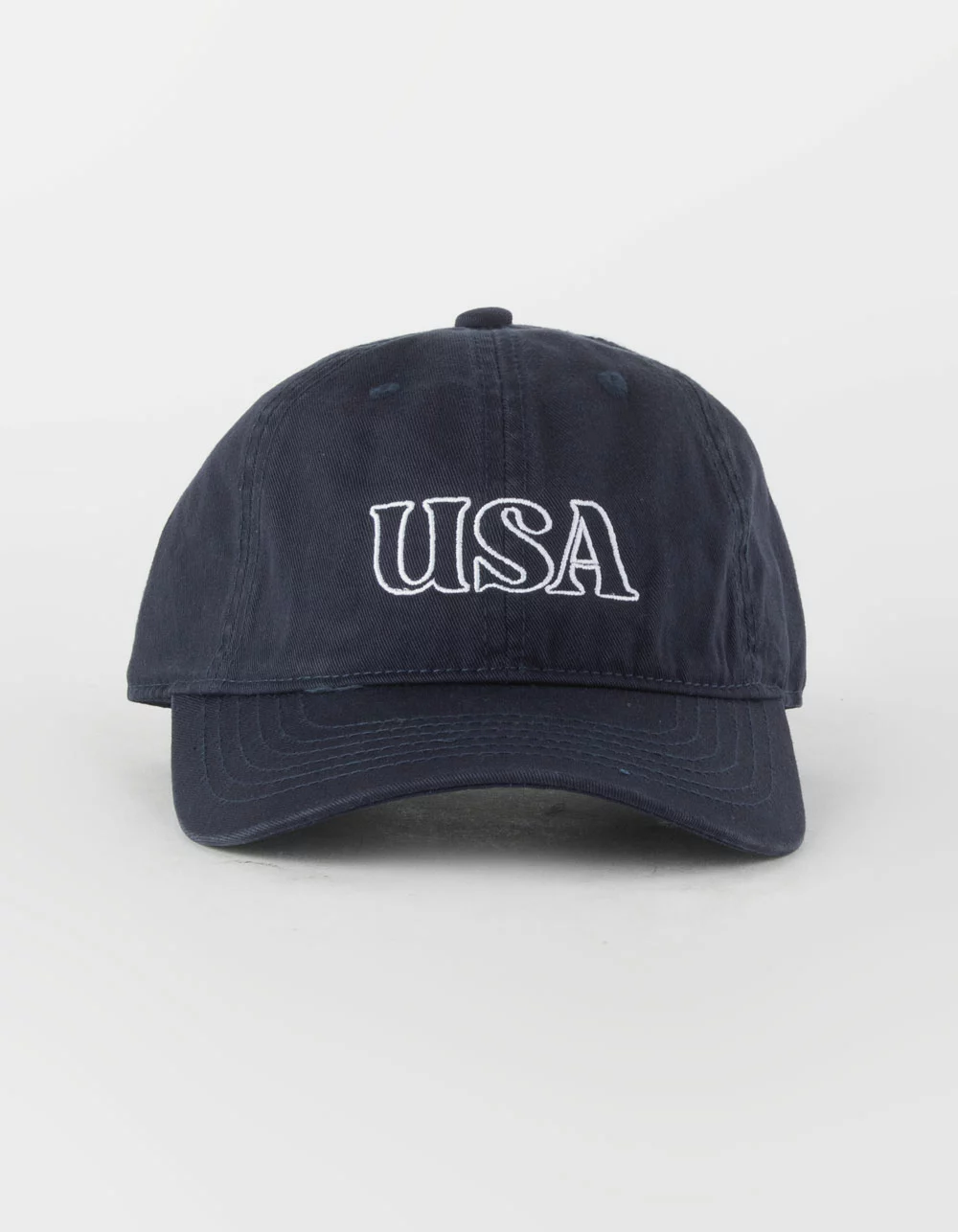 USA Dad Strapback Cap. Embroidery on front. Adjustable strapback. Curved visor. 100% Cotton. Machine wash. Imported.