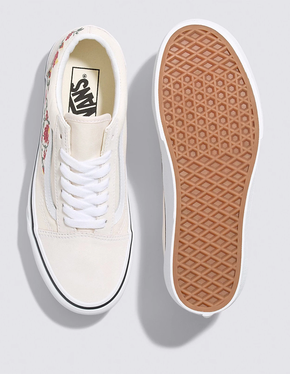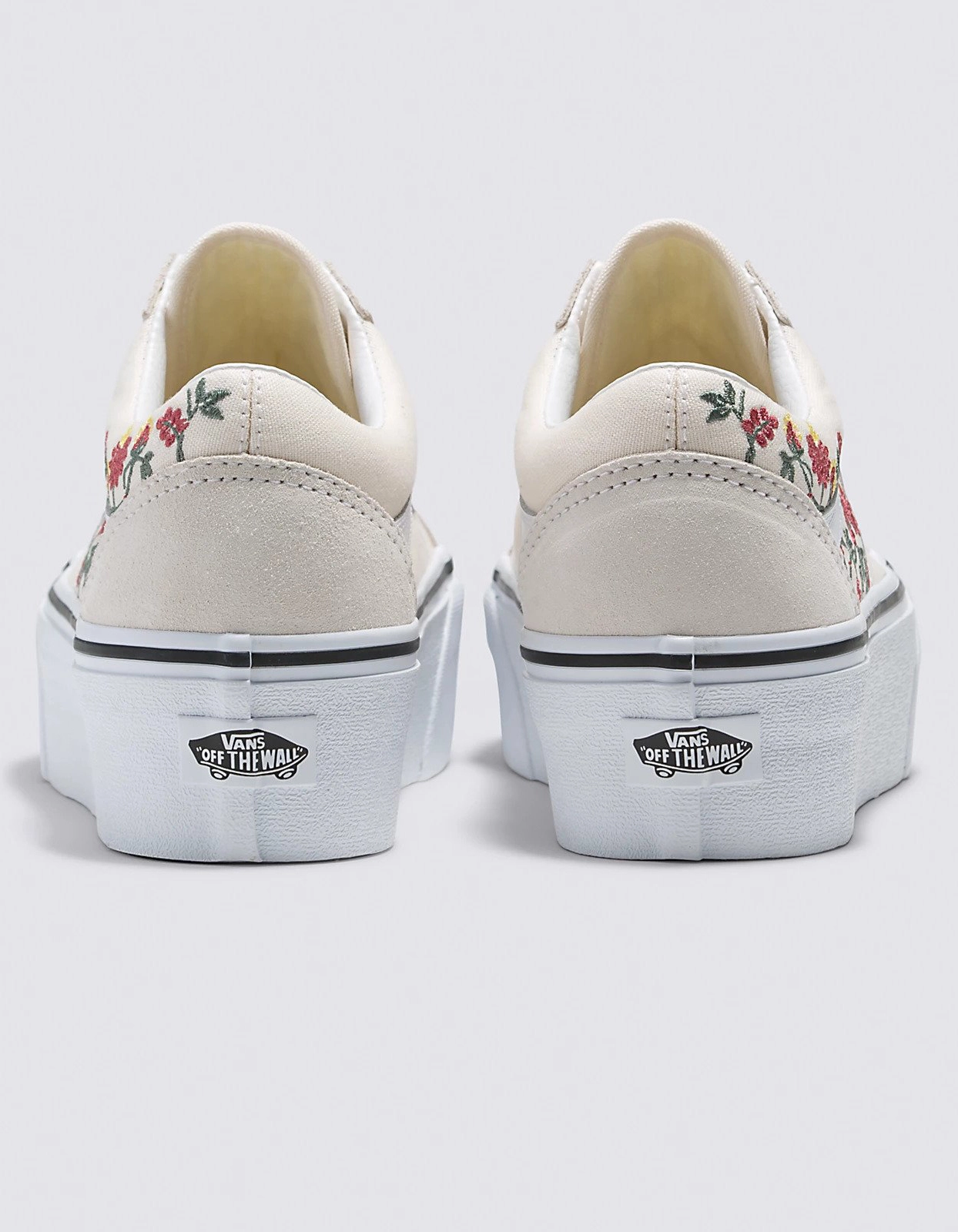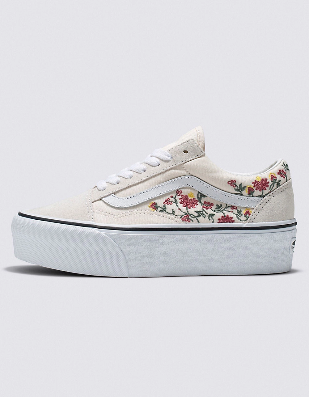 Vans Floral Embroidery Old Skool Stackform Shoes. The Floral Embroidery Old Skool Stackform refreshes our iconic Sidestripe⢠silhouette with an even chunkier take on the platform aesthetic. Constructed with a 34 mm sidewall height, this platform shoe elevates a classic favorite while bringing a new āOff The Wallā style to your look. Along with sturdy suede and canvas uppers featuring an array of embroidered flowers, the Floral Embroidery Old Skool Stackform is finished with supportive padded collars and signature rubber waffle outsoles. Imported.