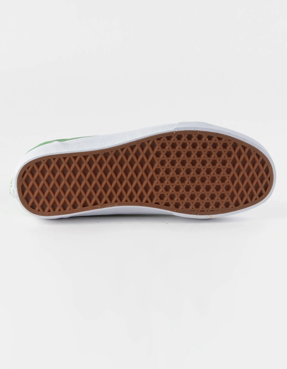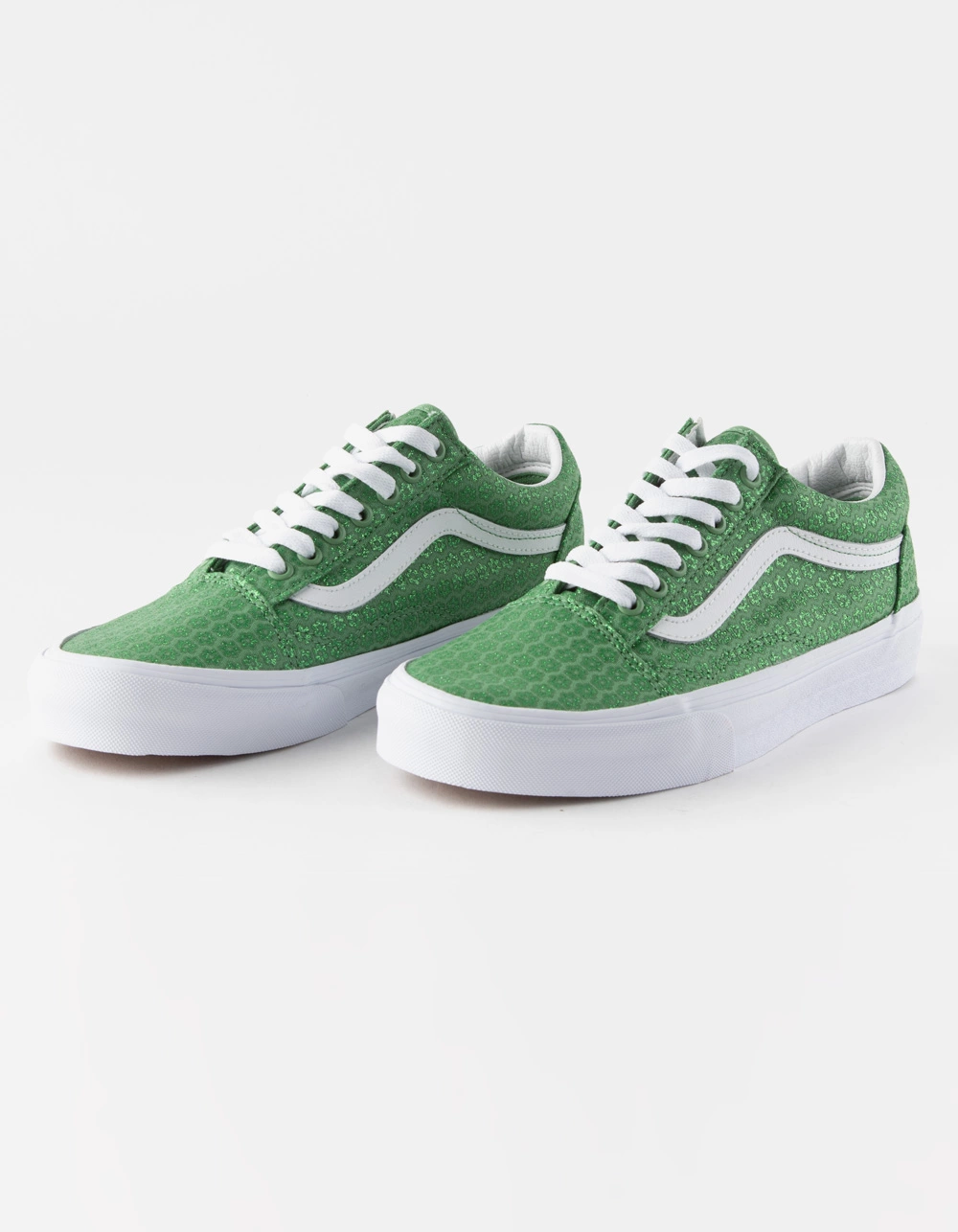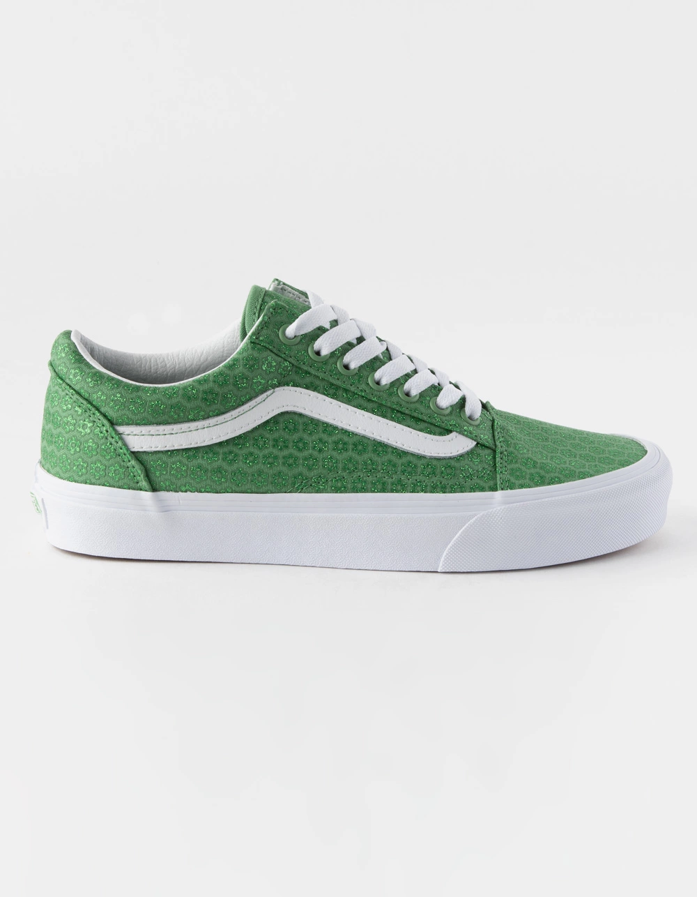 Vans Old Skool Shoes. The Old Skool has never been lacking in the attitude department. It brought the dawn of the classic Vans side stripe that has developed into a status symbol of tradition and skate stature. Aside from all that personality, they have lasted as long as they have because of their ability to perform on a skateboard, and to last, and last. Canvas upper. Glittered micro daisy pattern. Padded collar. Rubber waffle outsole. Lace up. Imported.