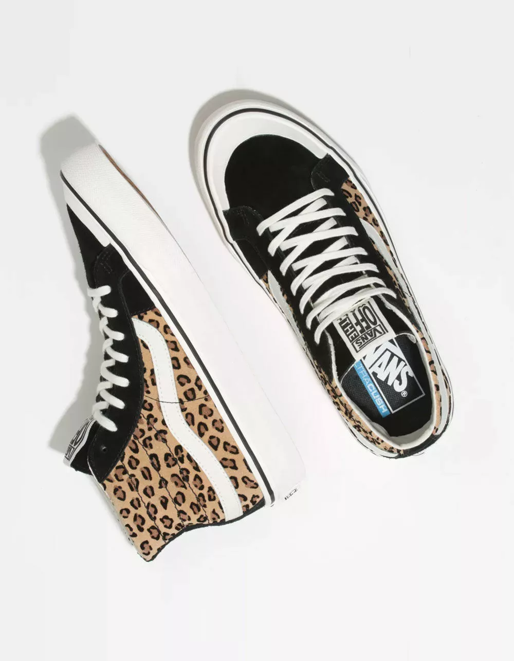 Vans Sk8-Hi 138 Decon SF Shoes. The Mini Leopard Sk8-Hi 138 Decon SF combines our iconic Vans high top skate shoe with the Vans Surf SF build to create an upgraded, deconstructed lace-up style. Featuring suede uppers with a miniature leopard print, it also includes rubber toecaps, molded UltraCush sockliners for upgraded cushioning, Pro Vulc Lite construction, and classic rubber waffle outsoles. It is made with water-based inks and glues. Features Vans “Off The Wall” logo on tongue. Imported.