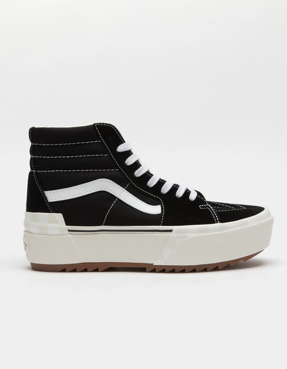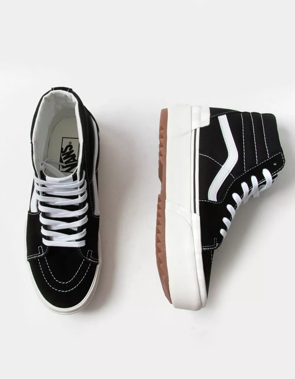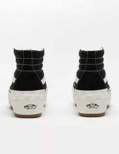 Vans Sk8-Hi Stacked Shoes. Oversized features. Platform bumpers and exaggerated outsoles. Heel and toe layers. Lace-up. Suede and canvas uppers. Approx. Platform height: 1.25″. Classic signature side stripe. Ripple sole. Padded collar. Imported.