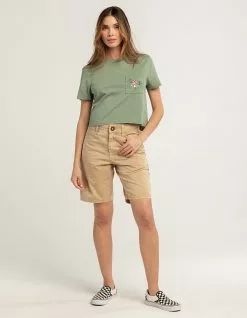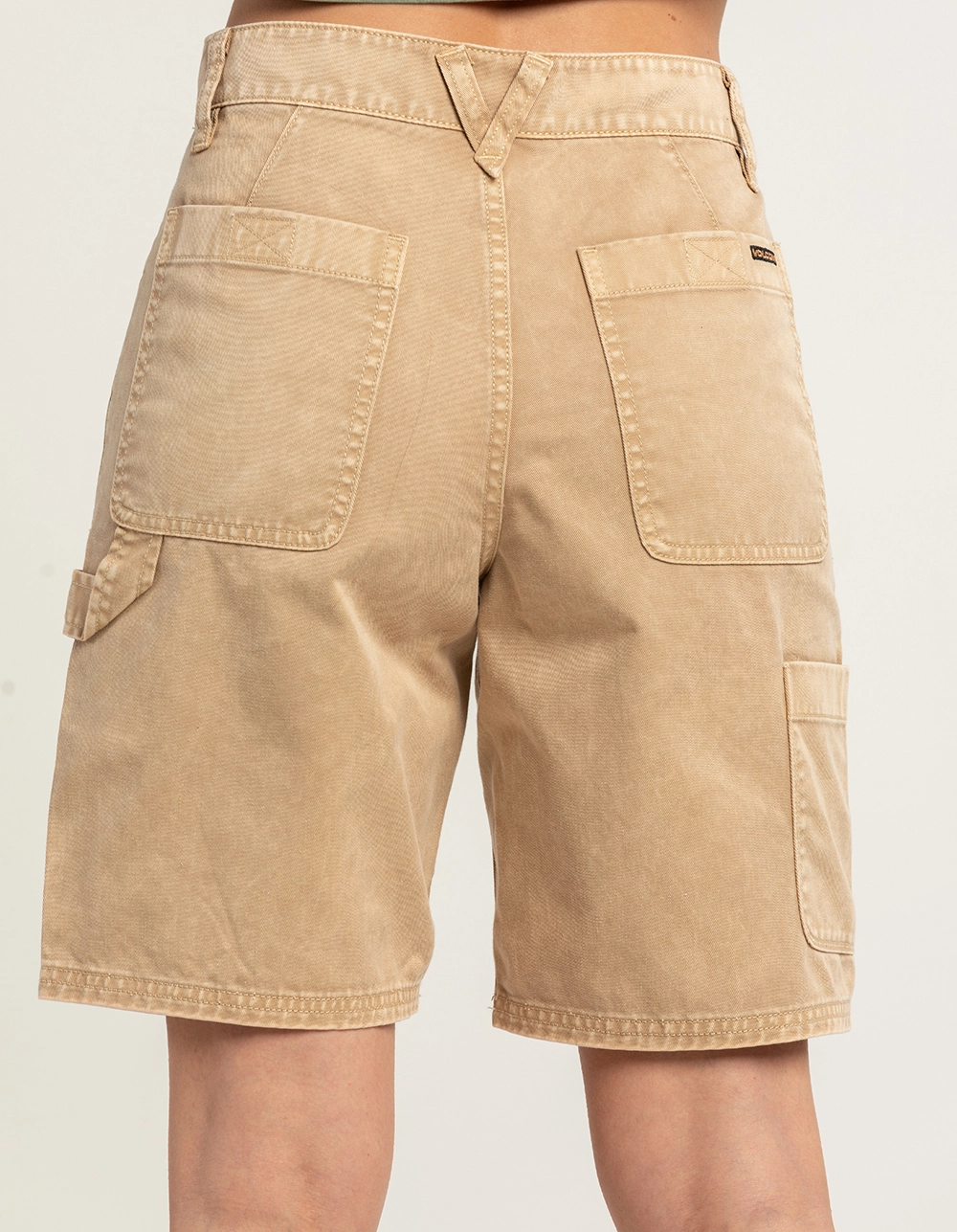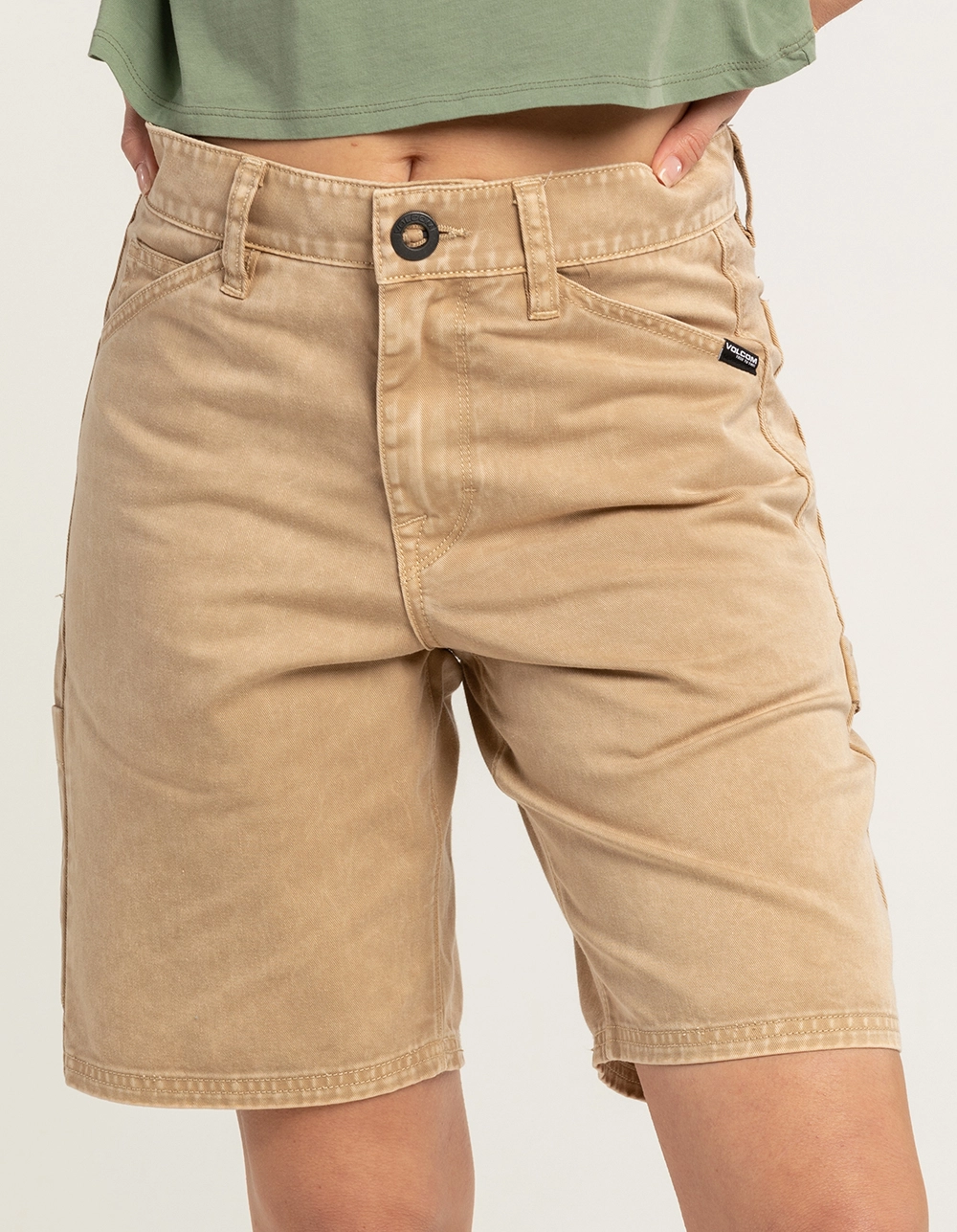 Volcom Kraftsman Mid Denim Shorts. Built to get the job done, the Kraftsman denim short is workwear for those who have a manual labor 9-5, but still get after it on a board once they clock out. Relaxed fit. Overdyed white denim with a heavy wash out for a vintage well worn look. Workwear inspired short with hard angled hand pockets. Large back patch pockets with velcro closures at top of pocket. Left hanger loop and right lower back thigh utility pocket. Volcom Brand signature details and branding. 19″ outseam. 60% Cotton, 40% Polyester. Machine wash. Imported.