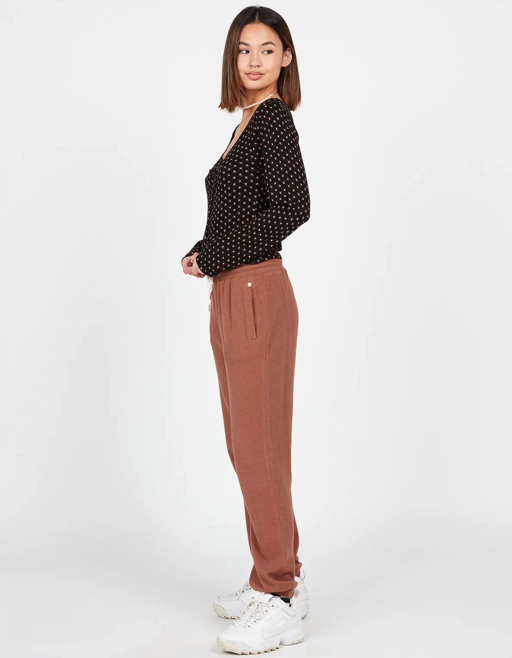 Volcom Lived In Lounge Fleece Pants. So soft you’ll never want to take them off, the Lived In Lounge fleece pants were designed with supreme softness and comfort in mind. Featuring side entry pockets and an elastic waist, you’ll enjoy maximum coziness all season long and a perfect, flexible fit in these. Fleece pull on pant with elasticated waist and side entry welt pockets. Rose Gold metal badge at hip. 63% Cotton, 34% Viscose, 3% Elastane. Machine wash. Imported.